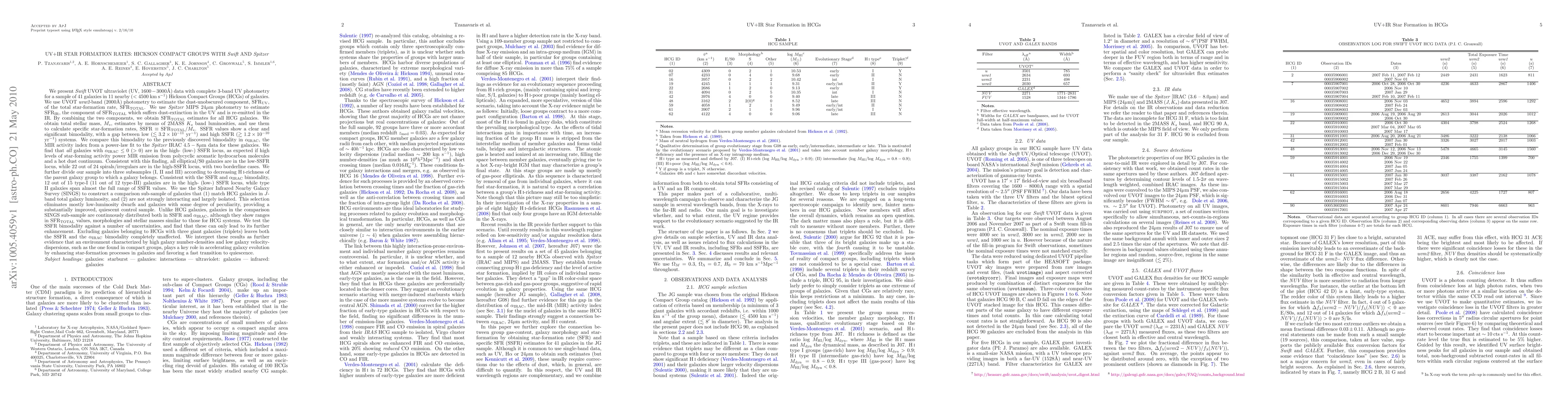 This paper investigates star formation rates in 41 galaxies within 11 Hickson Compact Groups using UV and IR data from Swift and Spitzer. It finds a significant bimodality in specific star formation rates (SSFR), with elliptical/S0 galaxies showing low SSFR and spirals/irregulars high SSFR, suggesting that dense, low-dispersion environments like compact groups accelerate galaxy evolution through enhanced star formation.