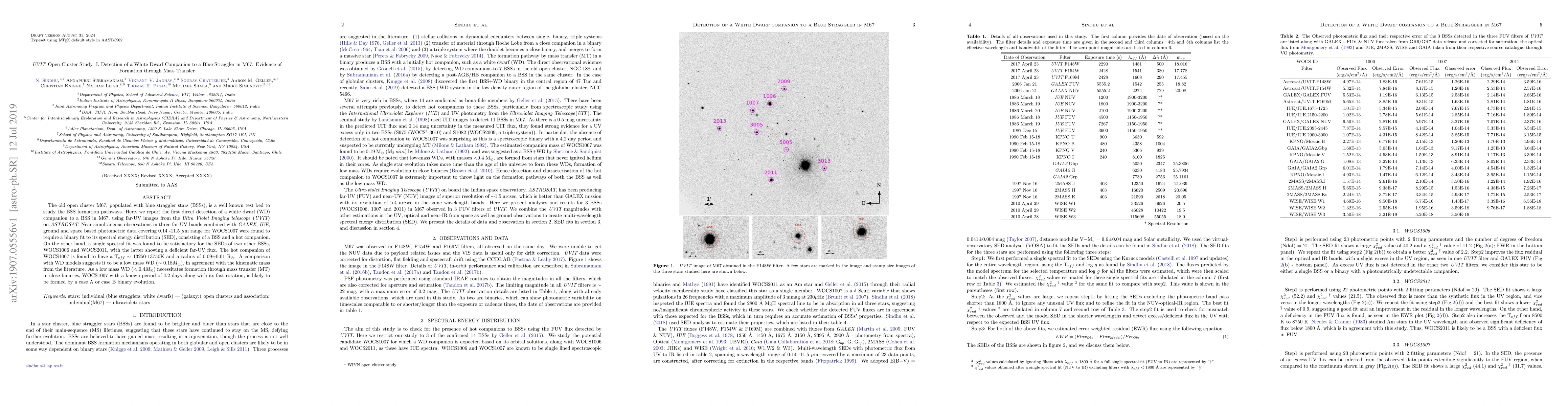 This study reports the detection of a white dwarf companion to a blue straggler star in the open cluster M67 using UVIT observations, revealing evidence for its formation via mass transfer in a close binary system. The white dwarf companion, with a temperature of ~13,250-13,750K, supports the theory of binary evolution pathways for blue straggler formation.