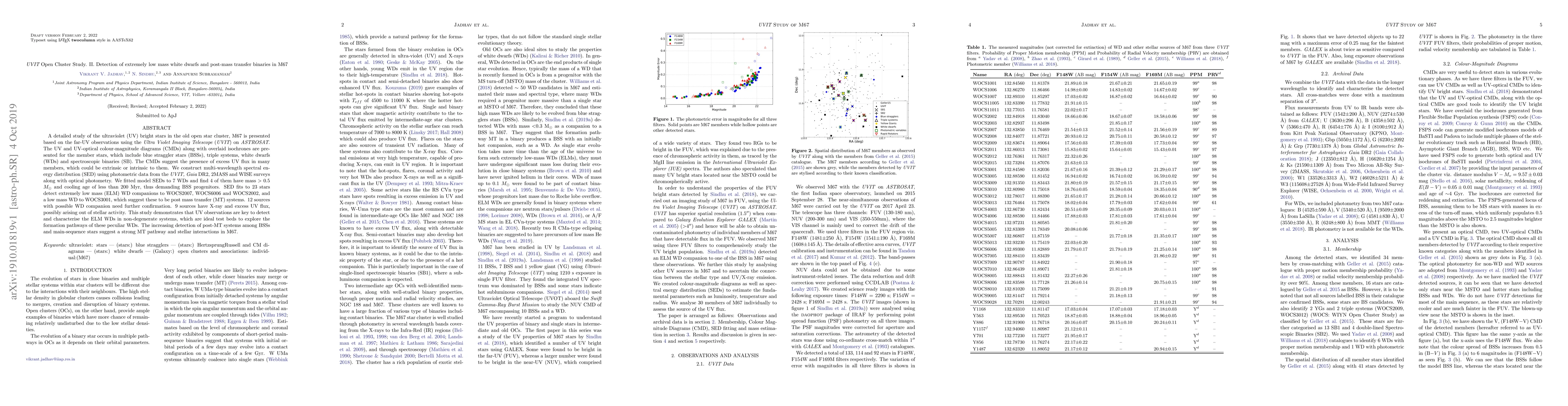 This study uses UVIT observations from ASTROSAT to analyze UV bright stars in the open cluster M67, identifying extremely low mass white dwarfs and post-mass transfer binaries. The findings suggest significant stellar interactions and mass transfer pathways in the cluster, highlighting the importance of UV observations for detecting such low-mass white dwarfs.