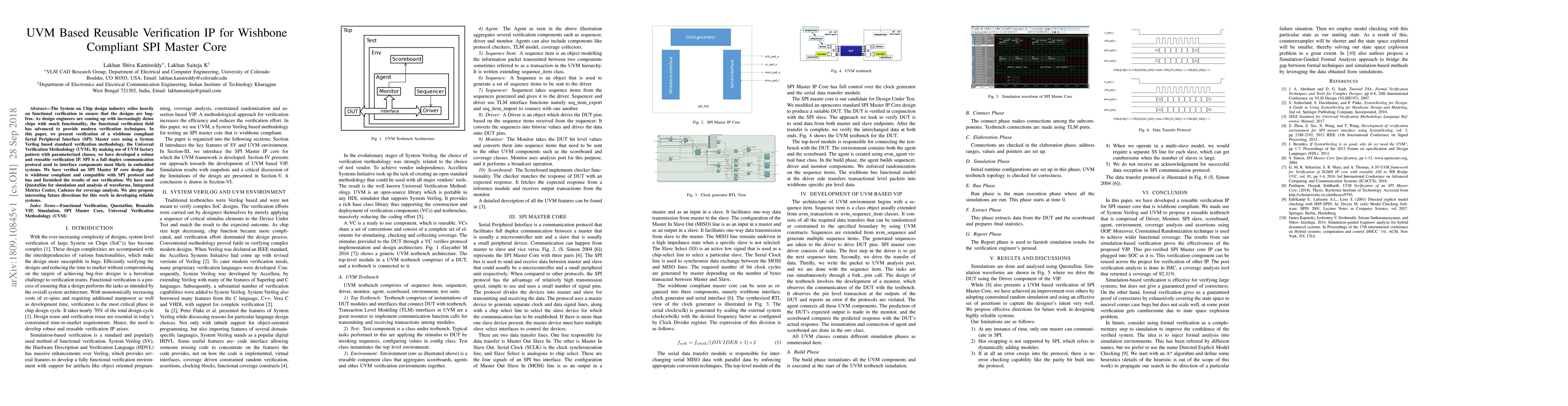 This paper presents a UVM-based verification methodology for a Wishbone compliant SPI Master core, utilizing the UVM factory pattern and parameterized classes for robust and reusable verification IP. The SPI Master IP core is verified using QuestaSim and Cadence tools, ensuring compatibility with SPI protocol and Wishbone bus.