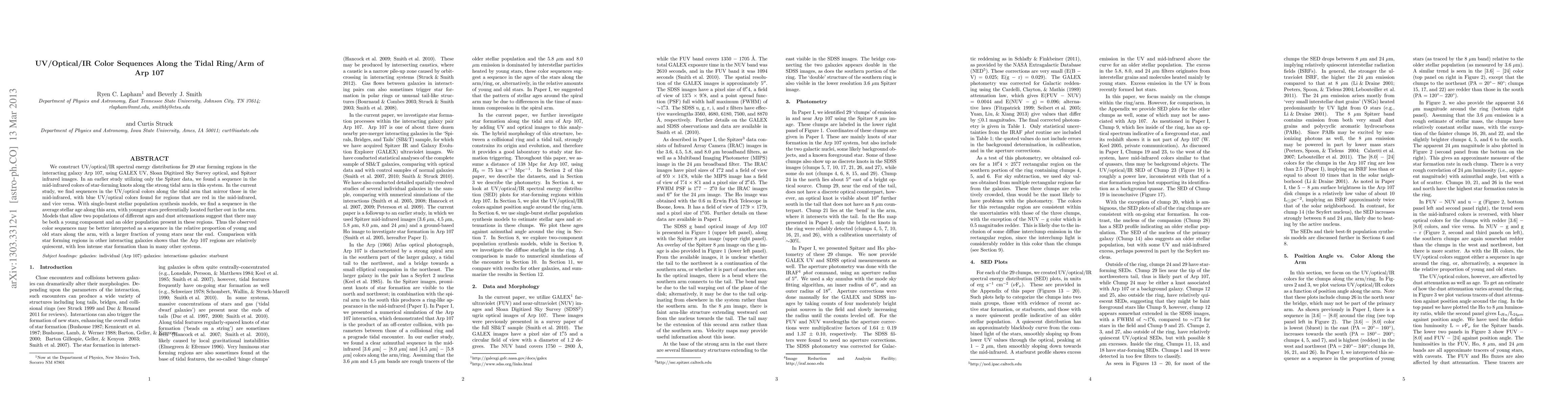 This study analyzes 29 star-forming regions in Arp 107, an interacting galaxy, using UV, optical, and IR data. It reveals color sequences in UV/optical and mid-infrared that mirror each other, suggesting a sequence in stellar age along the tidal arm, with younger stars found further out. Models indicate a mix of young and old stars, with a larger fraction of young stars near the arm's end. Compared to other interacting galaxies, Arp 107 shows relatively quiescent star formation.