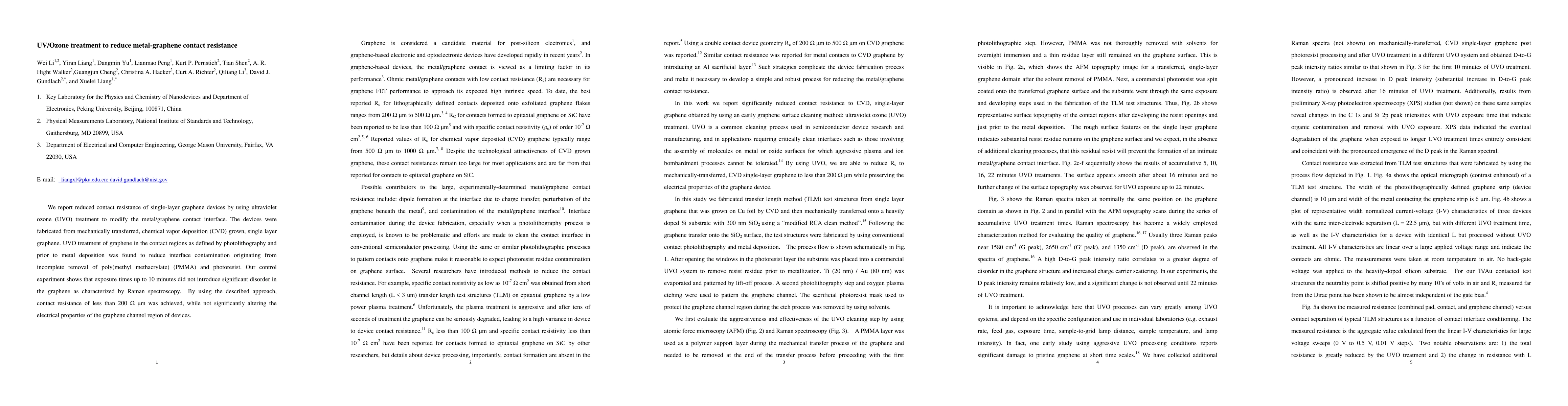 This research demonstrates that UV/ozone treatment effectively reduces the contact resistance in single-layer graphene devices by cleaning the metal/graphene interface, particularly removing residual contaminants from PMMA and photoresist, without causing significant graphene disorder, achieving contact resistance below 200 Ωμm.