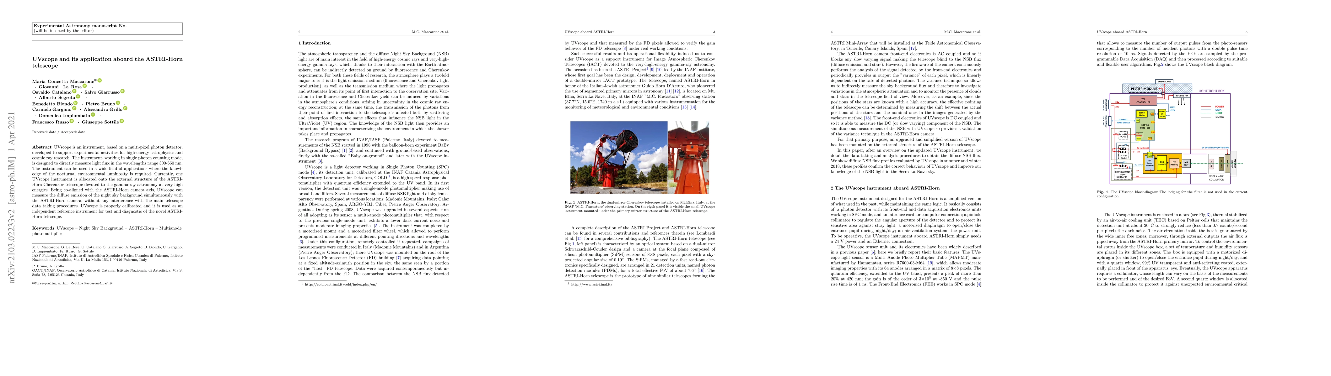 UVscope, a multi-pixel photon detector instrument, measures light flux in the 300-650 nm range and supports high-energy astrophysics and cosmic ray research. Installed on the ASTRI-Horn telescope, it simultaneously measures the night sky background without interfering with gamma-ray astronomy operations.