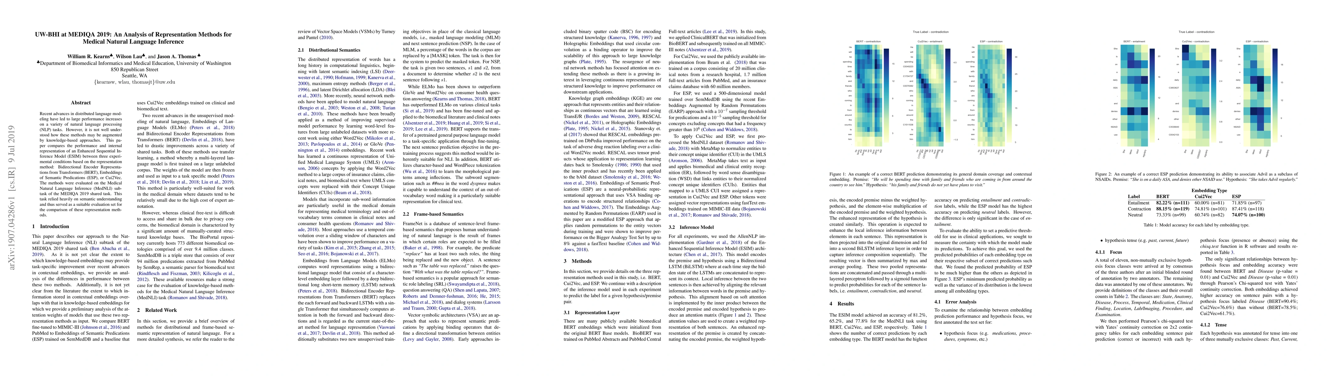 Recent advances in distributed language modeling have led to large performance increases on a variety of natural language processing (NLP) tasks. However, it is not well understood how these methods may be augmented by knowledge-based approaches. This paper compares the performance and internal representation of an Enhanced Sequential Inference Model (ESIM) between three experimental conditions based on the representation method: Bidirectional Encoder Representations from Transformers (BERT), Embeddings of Semantic Predications (ESP), or Cui2Vec. The methods were evaluated on the Medical Natural Language Inference (MedNLI) subtask of the MEDIQA 2019 shared task. This task relied heavily on semantic understanding and thus served as a suitable evaluation set for the comparison of these representation methods.