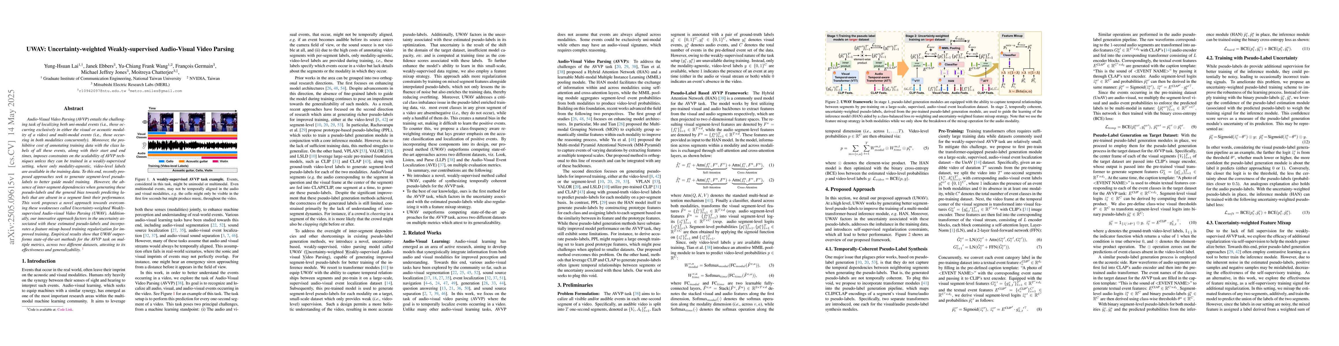 UWAV introduces an uncertainty-weighted approach for weakly-supervised AVVP, incorporating feature mixup regularization to improve training and pseudo-label reliability.