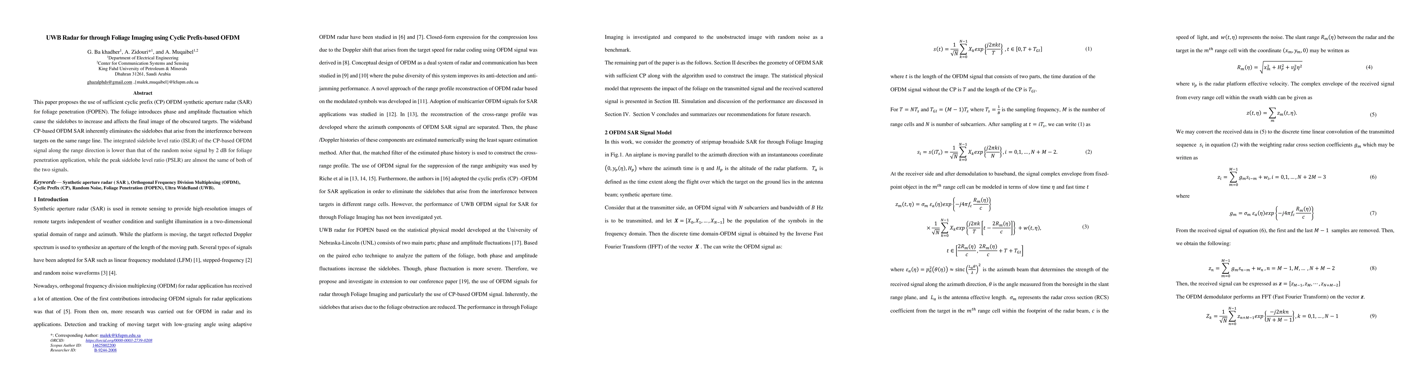 This paper introduces a cyclic prefix-based OFDM SAR for improved foliage penetration imaging, demonstrating a 2 dB reduction in integrated sidelobe level compared to random noise signals, while maintaining similar peak sidelobe levels. The method effectively mitigates interference between targets on the same range line.