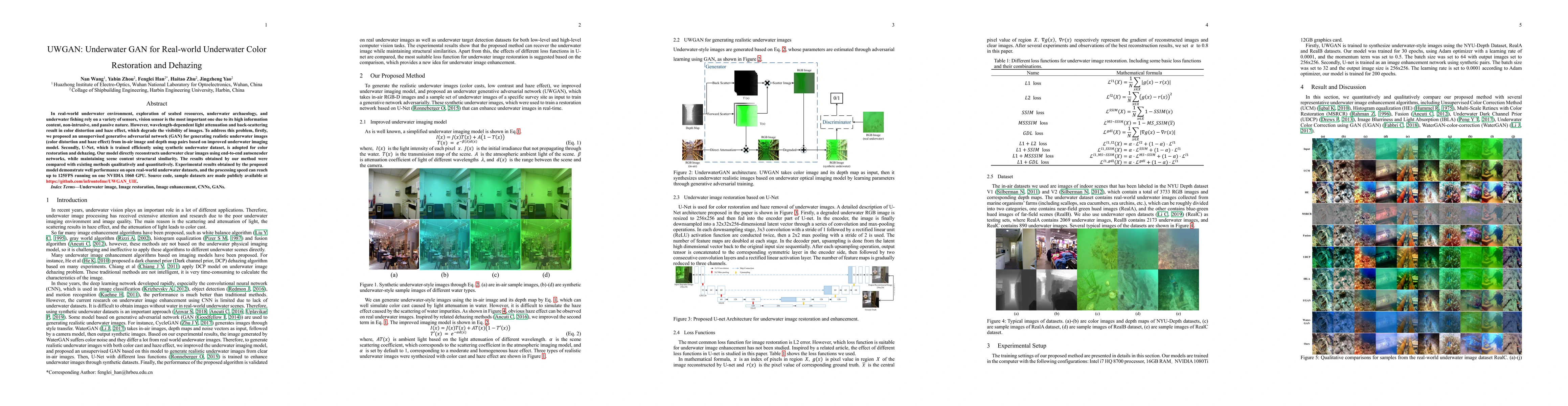 The paper proposes UWGAN, an unsupervised GAN for generating realistic underwater images from in-air images and depth maps, followed by a U-Net for color restoration and dehazing. Experimental results show superior performance and high processing speed on real-world datasets.
