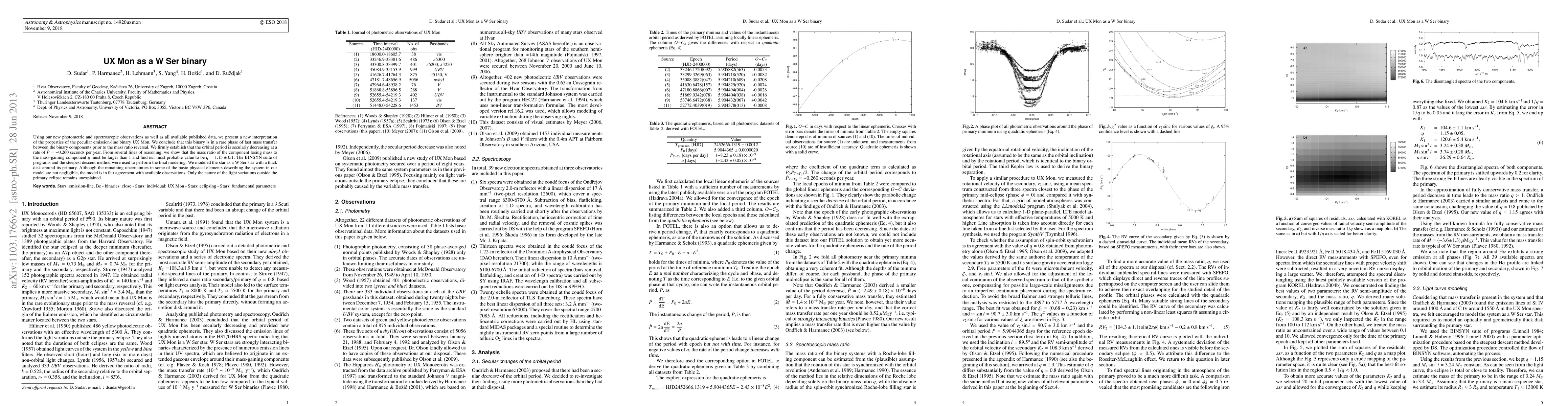 Using our new photometric and spectroscopic observations as well as all available published data, we present a new interpretation of the properties of the peculiar emission-line binary UX Mon. We conclude that this binary is in a rare phase of fast mass transfer between the binary components prior to the mass ratio reversal. We firmly establish that the orbital period is secularly decreasing at a rate of $\dot{P}=-0.260$ seconds per year. From several lines of reasoning, we show that the mass ratio of the component losing mass to the mass-gaining component $q$ must be larger than 1 and find our most probable value to be $q=1.15\pm0.1$. The BINSYN suite of programs and the steepest descent method were used to perform the final modeling. We modeled the star as a W Ser star with a thick disk around its primary. Although the remaining uncertainties in some of the basic physical elements describing the system in our model are not negligible, the model is in fair agreement with available observations. Only the nature of the light variations outside the primary eclipse remains unexplained.