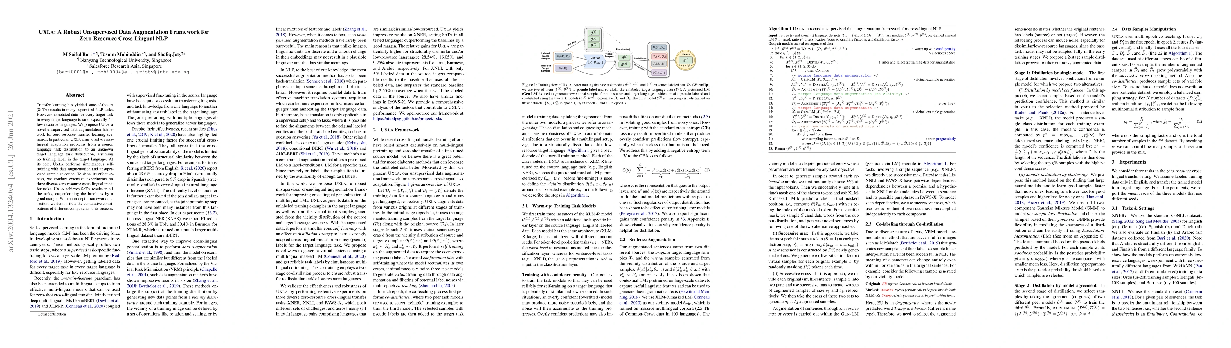 UXLA is an unsupervised data augmentation framework designed for zero-resource cross-lingual NLP tasks, achieving state-of-the-art results by performing simultaneous self-training and sample selection. The framework effectively transfers knowledge from a source language to an unknown target language without labeled data.