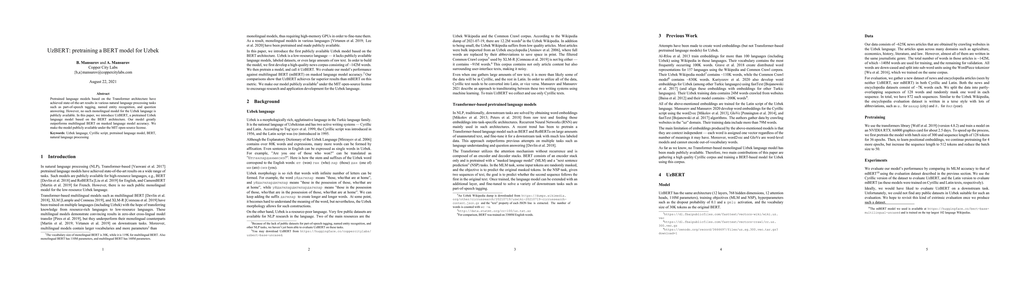 Pretrained language models based on the Transformer architecture have achieved state-of-the-art results in various natural language processing tasks such as part-of-speech tagging, named entity recognition, and question answering. However, no such monolingual model for the Uzbek language is publicly available. In this paper, we introduce UzBERT, a pretrained Uzbek language model based on the BERT architecture. Our model greatly outperforms multilingual BERT on masked language model accuracy. We make the model publicly available under the MIT open-source license.