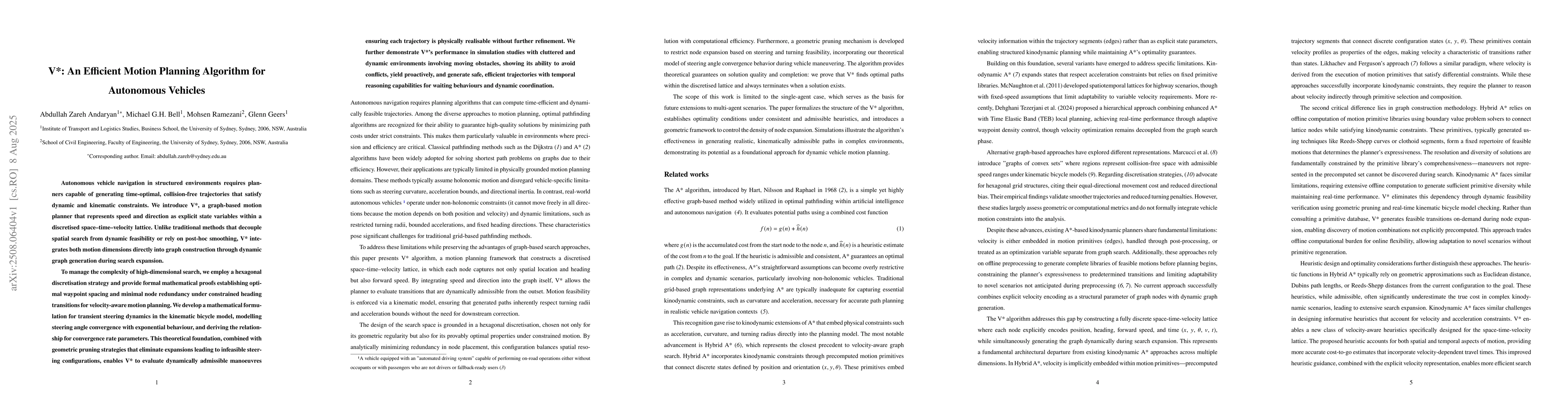 Autonomous vehicle navigation in structured environments requires planners capable of generating time-optimal, collision-free trajectories that satisfy dynamic and kinematic constraints. We introduce V*, a graph-based motion planner that represents speed and direction as explicit state variables within a discretised space-time-velocity lattice. Unlike traditional methods that decouple spatial search from dynamic feasibility or rely on post-hoc smoothing, V* integrates both motion dimensions directly into graph construction through dynamic graph generation during search expansion. To manage the complexity of high-dimensional search, we employ a hexagonal discretisation strategy and provide formal mathematical proofs establishing optimal waypoint spacing and minimal node redundancy under constrained heading transitions for velocity-aware motion planning. We develop a mathematical formulation for transient steering dynamics in the kinematic bicycle model, modelling steering angle convergence with exponential behaviour, and deriving the relationship for convergence rate parameters. This theoretical foundation, combined with geometric pruning strategies that eliminate expansions leading to infeasible steering configurations, enables V* to evaluate dynamically admissible manoeuvres, ensuring each trajectory is physically realisable without further refinement. We further demonstrate V*'s performance in simulation studies with cluttered and dynamic environments involving moving obstacles, showing its ability to avoid conflicts, yield proactively, and generate safe, efficient trajectories with temporal reasoning capabilities for waiting behaviours and dynamic coordination.