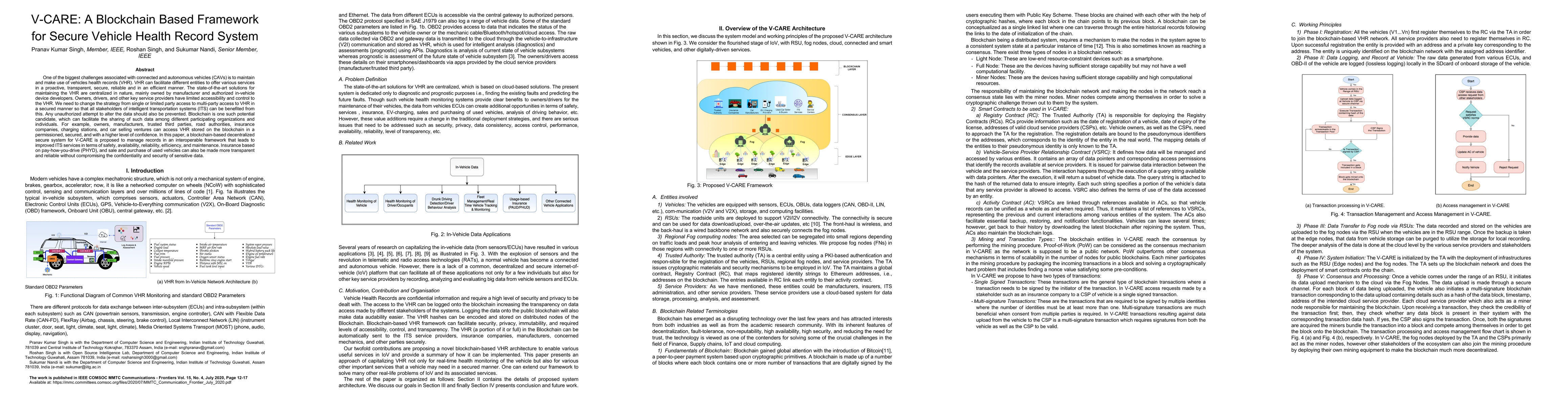 One of the biggest challenges associated with connected and autonomous vehicles (CAVs) is to maintain and make use of vehicles health records (VHR). VHR can facilitate different entities to offer various services in a proactive, transparent, secure, reliable and in an efficient manner. The state-of-the-art solutions for maintaining the VHR are centralized in nature, mainly owned by manufacturer and authorized in-vehicle device developers. Owners, drivers, and other key service providers have limited accessibility and control to the VHR. We need to change the strategy from single or limited party access to multi-party access to VHR in an secured manner so that all stakeholders of intelligent transportation system (ITS) can be benefited from this. Any unauthorized attempt to alter the data should also be prevented. Blockchain is one such potential candidate, which can facilitate the sharing of such data among different participating organizations and individuals. For example, owners, manufacturers, trusted third parties, road authorities, insurance companies, charging stations, and car selling ventures can access VHR stored on the blockchain in a permissioned, secured, and with a higher level of confidence. In this paper, a blockchain-based decentralized secure system for V-CARE is proposed to manage records in an interoperable framework that leads to improved ITS services in terms of safety, availability, reliability, efficiency, and maintenance. Insurance based on pay-how-you-drive (PHYD), and sale and purchase of used vehicles can also be made more transparent and reliable without compromising the confidentiality and security of sensitive data.