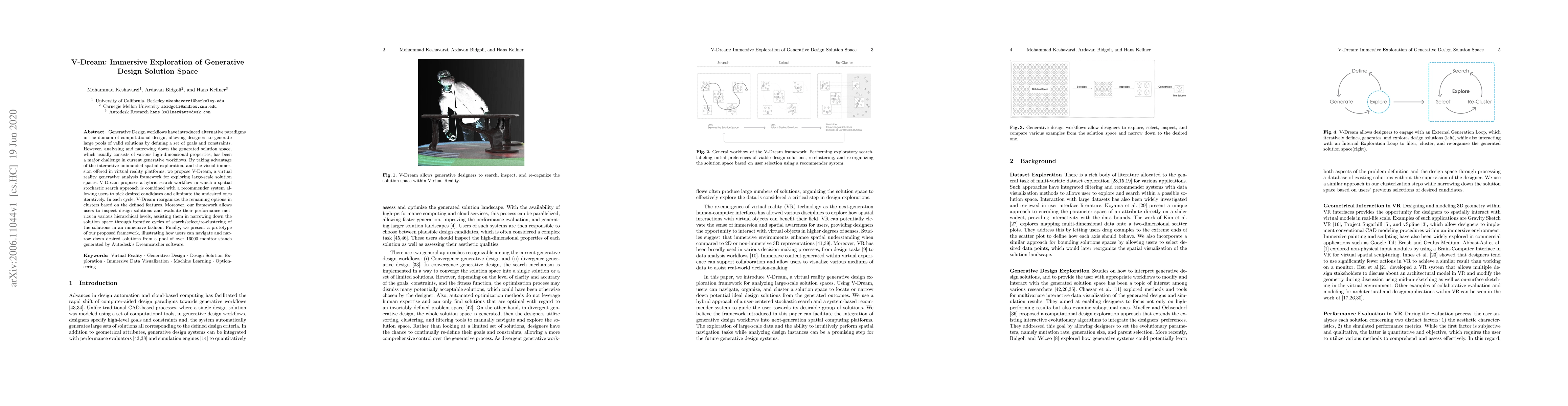 V-Dream is a virtual reality framework that leverages immersive exploration to analyze and narrow down large-scale solution spaces generated by generative design workflows. It combines a spatial stochastic search with a recommender system to iteratively refine solutions, allowing users to navigate and evaluate design options in a visually immersive environment.