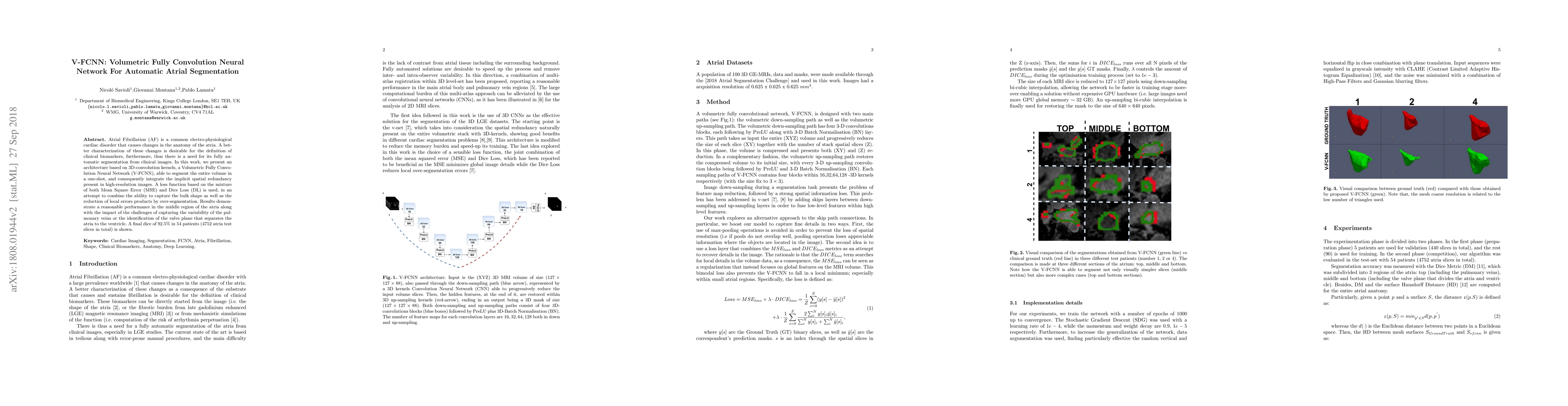 This paper introduces a Volumetric Fully Convolutional Neural Network (V-FCNN) for automatic atrial segmentation in patients with Atrial Fibrillation. The V-FCNN uses 3D convolutions to segment the entire atrial volume in one pass, achieving a Dice score of 92.5% across 54 patients, demonstrating its effectiveness despite challenges in segmenting pulmonary veins and valve planes.