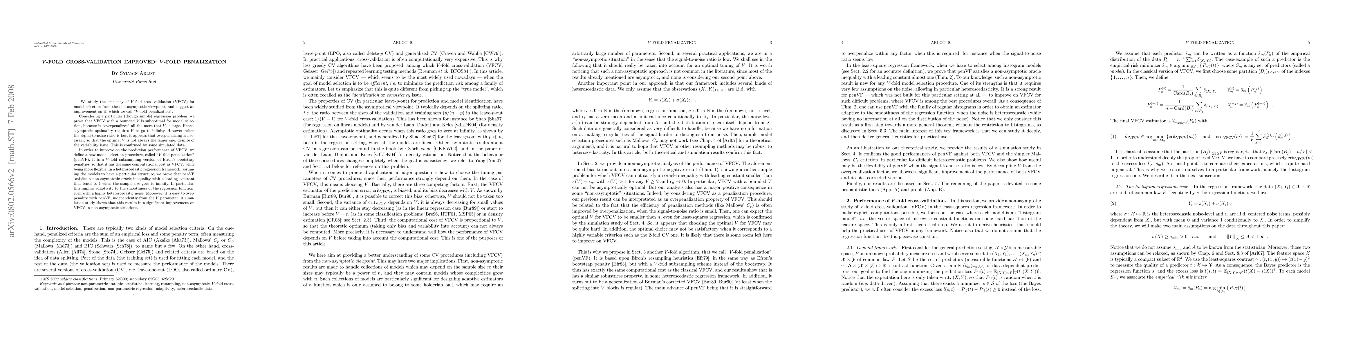This paper proposes an improvement to V-fold cross-validation called "V-fold penalization" (penVF) to enhance model selection efficiency. It demonstrates that traditional VFCV overpenalizes models, especially for large V, leading to suboptimal performance, and suggests penVF as a more flexible and adaptive alternative that performs better in non-asymptotic settings.