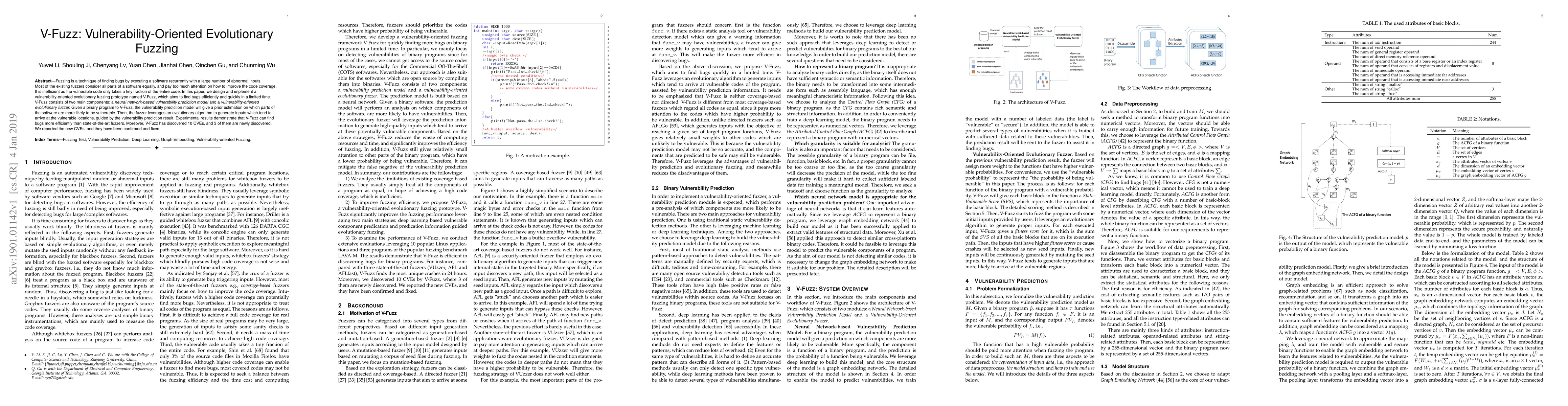 V-Fuzz is a vulnerability-oriented evolutionary fuzzing prototype designed to efficiently locate bugs by prioritizing vulnerable code sections. It combines a neural network-based vulnerability prediction model with an evolutionary fuzzer to generate inputs targeting likely vulnerable areas, resulting in more efficient bug discovery compared to traditional fuzzers.