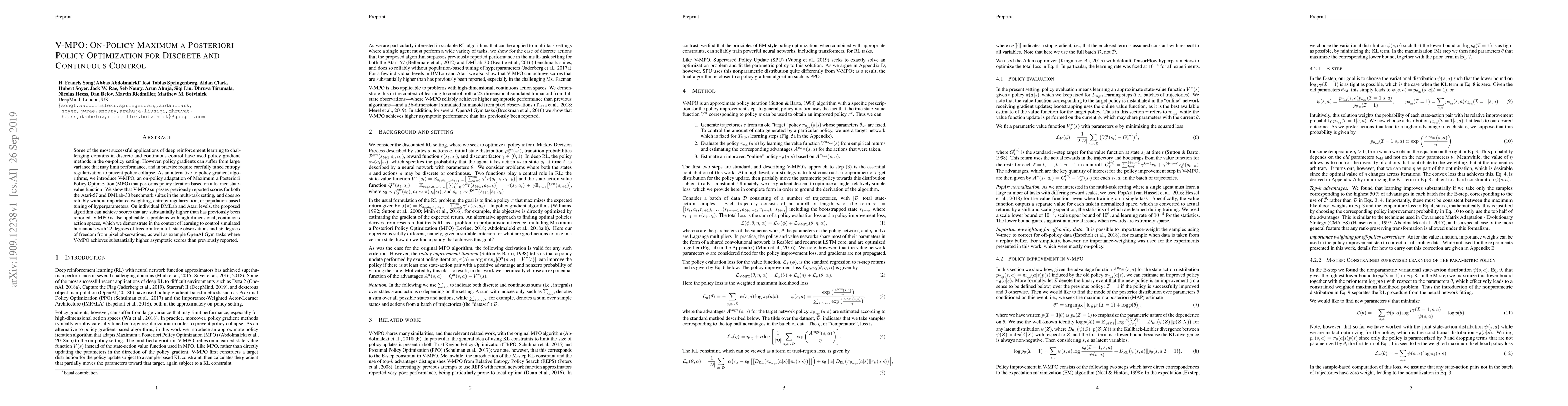 V-MPO is an on-policy adaptation of Maximum a Posteriori Policy Optimization that outperforms traditional policy gradient methods in both discrete and continuous control tasks, achieving higher scores without the need for entropy regularization or hyperparameter tuning. It demonstrates superior performance in multi-task settings and high-dimensional environments.