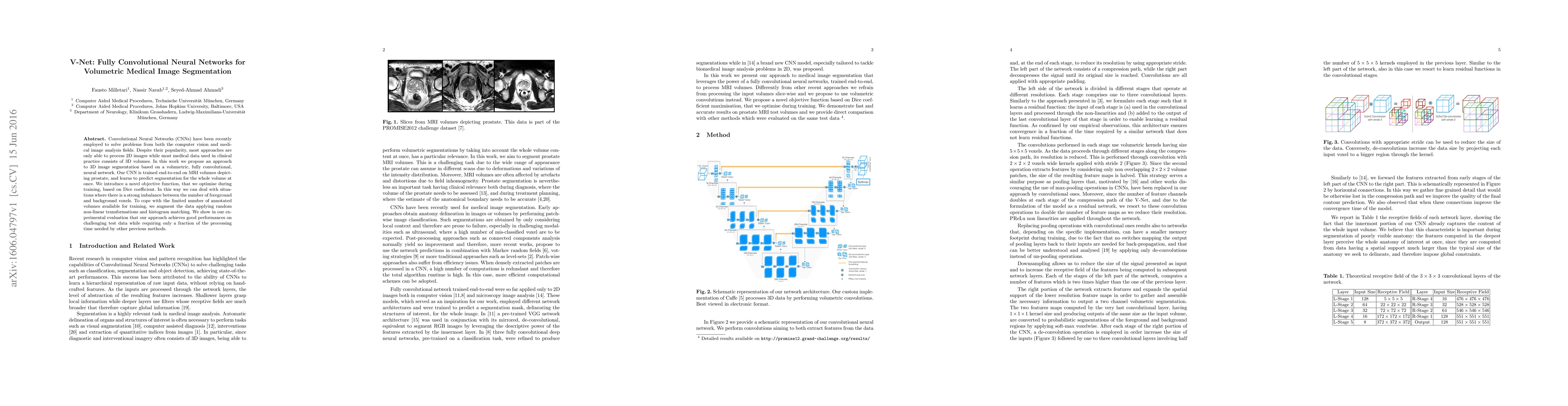 V-Net presents a fully convolutional neural network for 3D volumetric segmentation, trained on MRI prostate images using an objective function based on the Dice coefficient, which handles class imbalance. The method is efficient and achieves high performance, leveraging data augmentation to overcome limited training data.