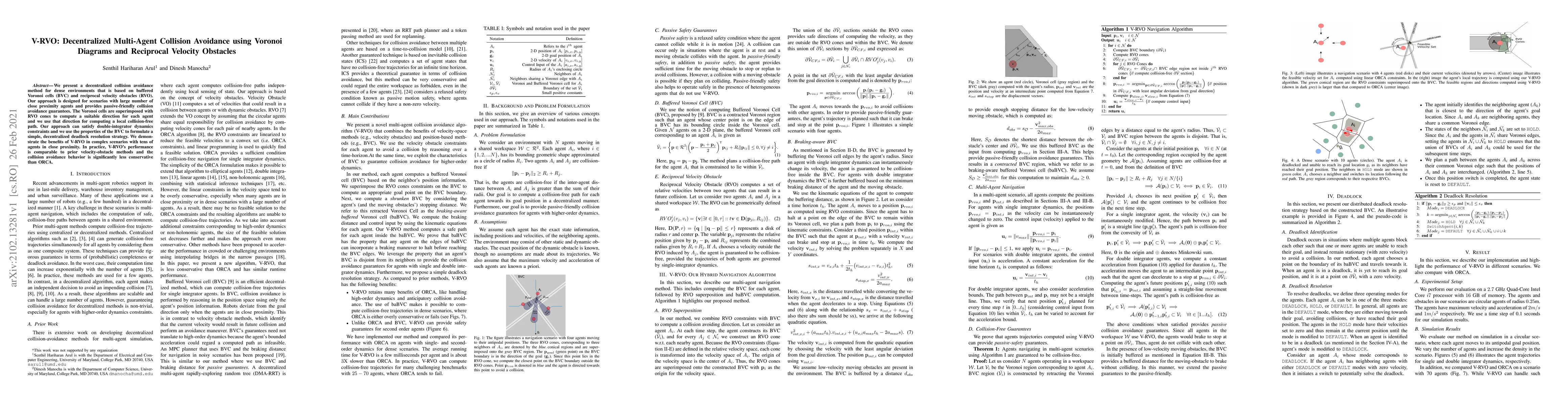 This paper introduces V-RVO, a decentralized collision avoidance method for dense multi-agent environments using buffered Voronoi cells and reciprocal velocity obstacles. It provides a passive-friendly strategy for navigating tens of agents, ensuring local collision-free paths and deadlock resolution.