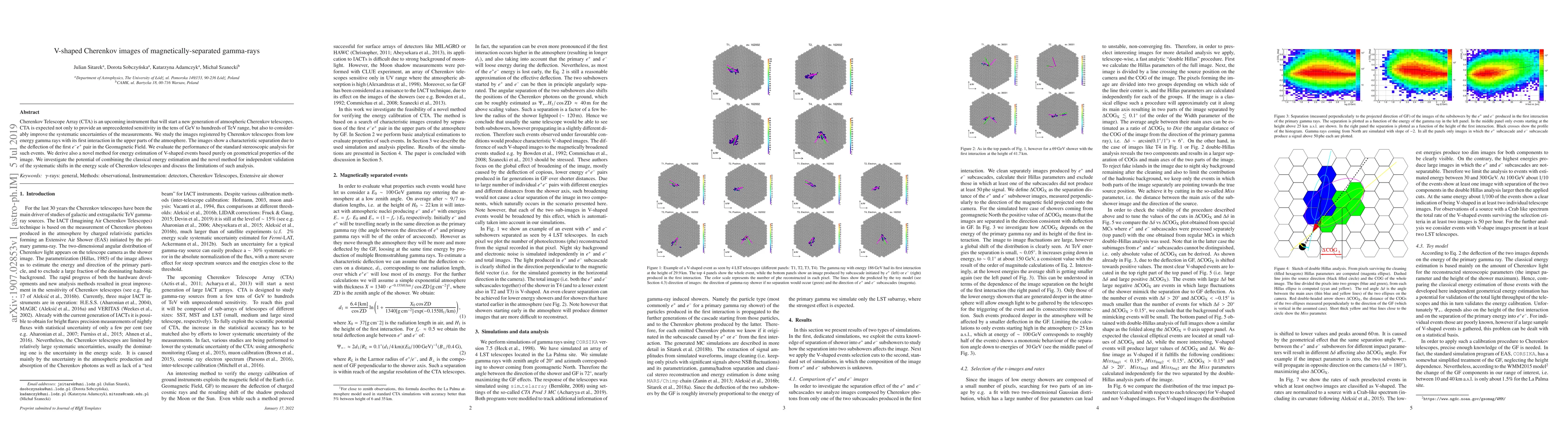 Cherenkov Telescope Array (CTA) is an upcoming instrument that will start a new generation of atmospheric Cherenkov telescopes. CTA is expected not only to provide an unprecedented sensitivity in the tens of GeV to hundreds of TeV range, but also to considerably improve the systematic uncertainties of the measurements. We study the images registered by Cherenkov telescopes from low energy gamma rays with its first interaction in the upper parts of the atmosphere. The images show a characteristic separation due to the deflection of the first e- e+ pair in the Geomagnetic Field. We evaluate the performance of the standard stereoscopic analysis for such events. We derive also a novel method for energy estimation of V-shaped events based purely on geometrical properties of the image. We investigate the potential of combining the classical energy estimation and the novel method for independent validation of the systematic shifts in the energy scale of Cherenkov telescopes and discuss the limitations of such analysis.