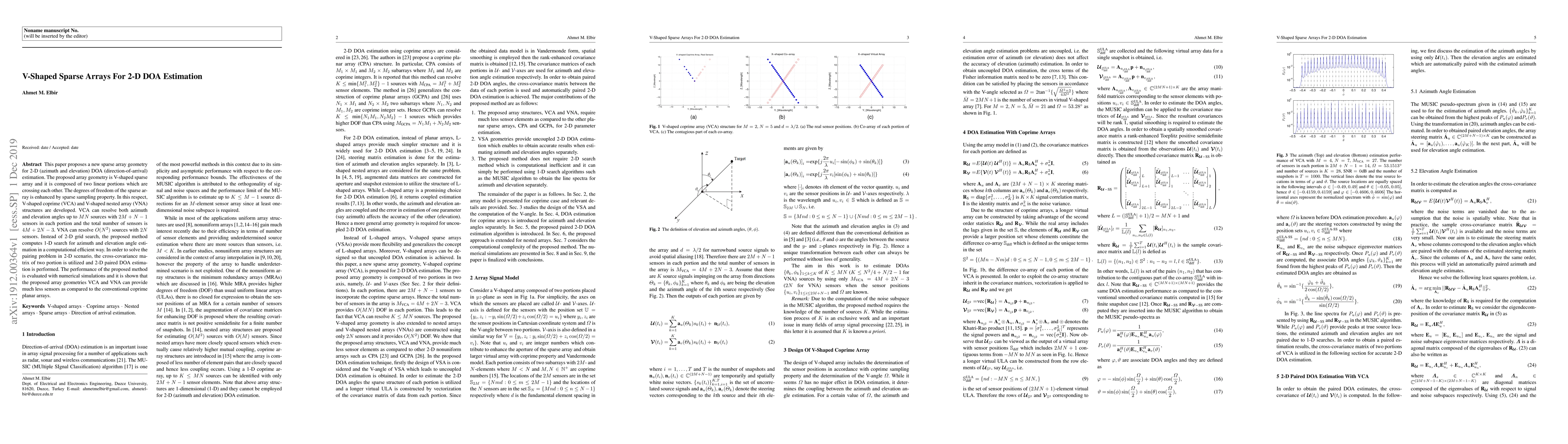 This paper proposes V-shaped sparse arrays for 2-D direction-of-arrival estimation, utilizing V-shaped coprime and nested array structures to enhance degrees of freedom and reduce sensor count. The method employs 1-D search over cross-covariance matrices for efficient angle estimation.