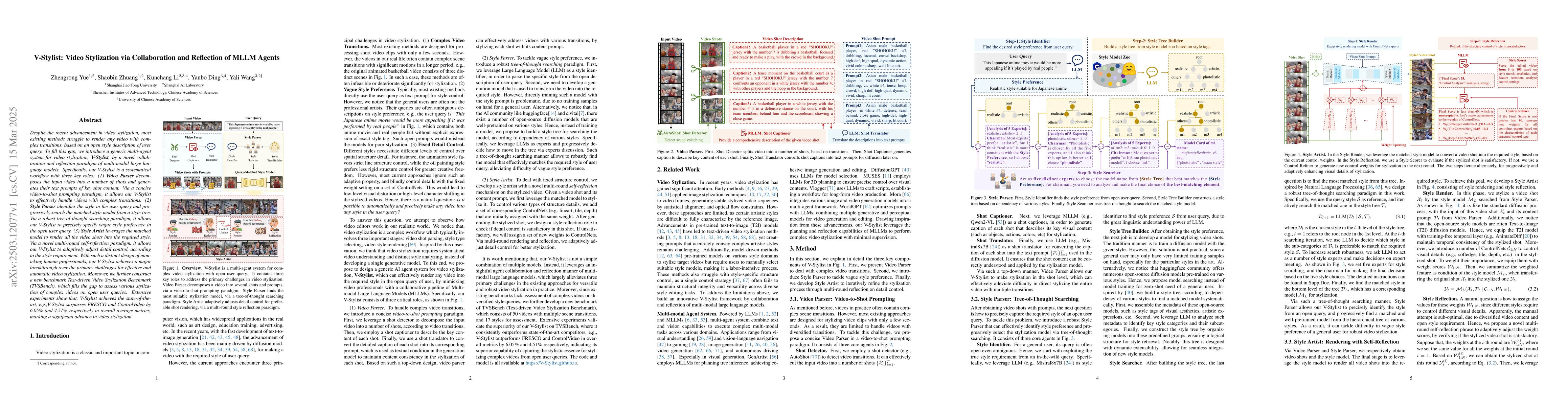 V-Stylist introduces a multi-agent system for video stylization using a collaboration and reflection paradigm of multi-modal large language models, achieving state-of-the-art results by effectively handling complex video transitions and open style queries. The system also establishes a new benchmark, TVSBench, to evaluate complex video stylization.