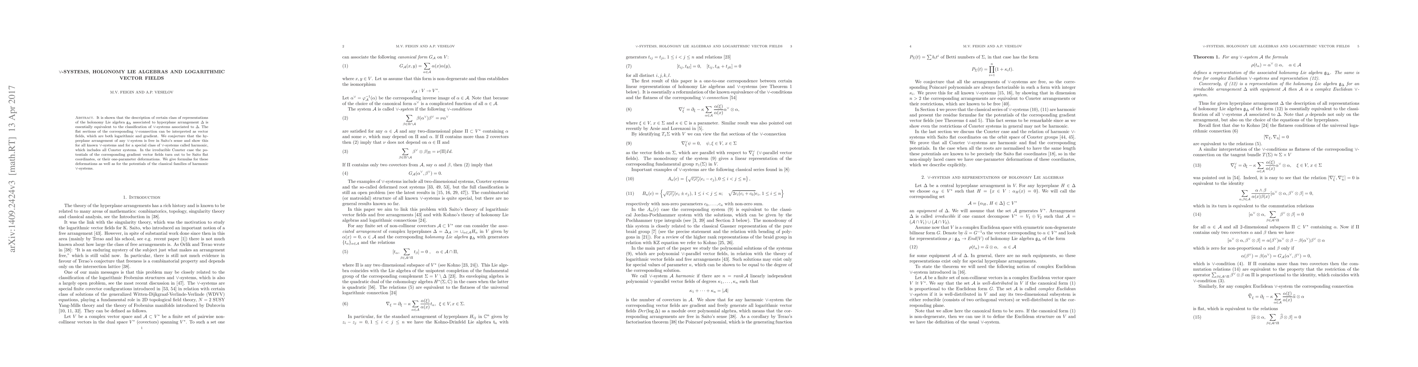 This paper establishes a connection between representations of holonomy Lie algebras related to hyperplane arrangements and the classification of $\vee$-systems. It also shows that the flat sections of $\vee$-connections correspond to logarithmic and gradient vector fields, and conjectures that the hyperplane arrangements of $\vee$-systems are free in Saito's sense, proving this for known systems and harmonic $\vee$-systems, including Coxeter systems.