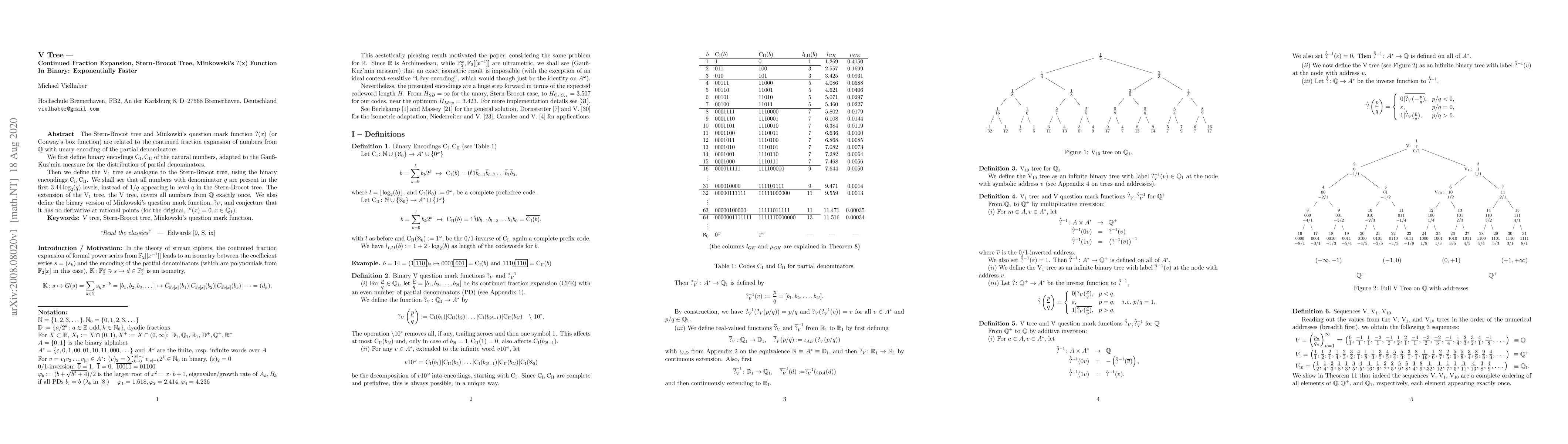 The paper explores binary encodings of the Stern-Brocot tree and Minkowski's question mark function, showing that numbers with denominator $q$ appear in the V$_1$ tree at $3.44\log_2(q)$ levels, significantly faster than in the Stern-Brocot tree. It proposes a binary version of Minkowski's function, $?_V$, and hypothesizes it lacks a derivative at rational points.