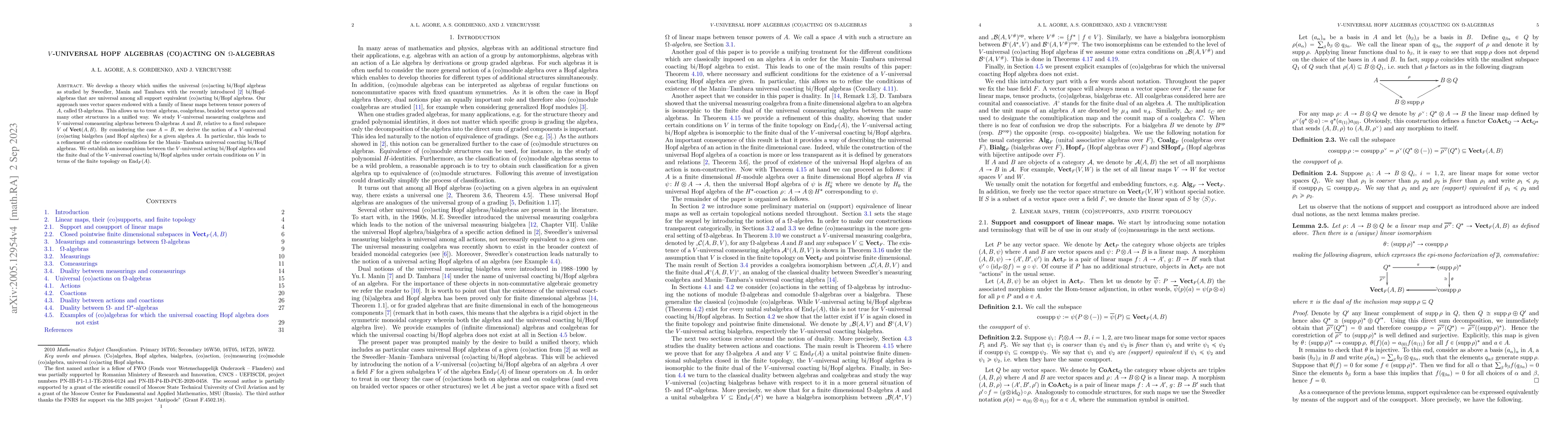 We develop a theory which unifies the universal (co)acting bi/Hopf algebras as studied by Sweedler, Manin and Tambara with the recently introduced \cite{AGV1} bi/Hopf-algebras that are universal among all support equivalent (co)acting bi/Hopf algebras. Our approach uses vector spaces endowed with a family of linear maps between tensor powers of $A$, called $\Omega$-algebras. This allows us to treat algebras, coalgebras, braided vector spaces and many other structures in a unified way. We study $V$-universal measuring coalgebras and $V$-universal comeasuring algebras between $\Omega$-algebras $A$ and $B$, relative to a fixed subspace $V$ of $\Vect(A,B)$. By considering the case $A=B$, we derive the notion of a $V$-universal (co)acting bialgebra (and Hopf algebra) for a given algebra $A$. In particular, this leads to a refinement of the existence conditions for the Manin--Tambara universal coacting bi/Hopf algebras. We establish an isomorphism between the $V$-universal acting bi/Hopf algebra and the finite dual of the $V$-universal coacting bi/Hopf algebra under certain conditions on $V$ in terms of the finite topology on $\End_F(A)$.