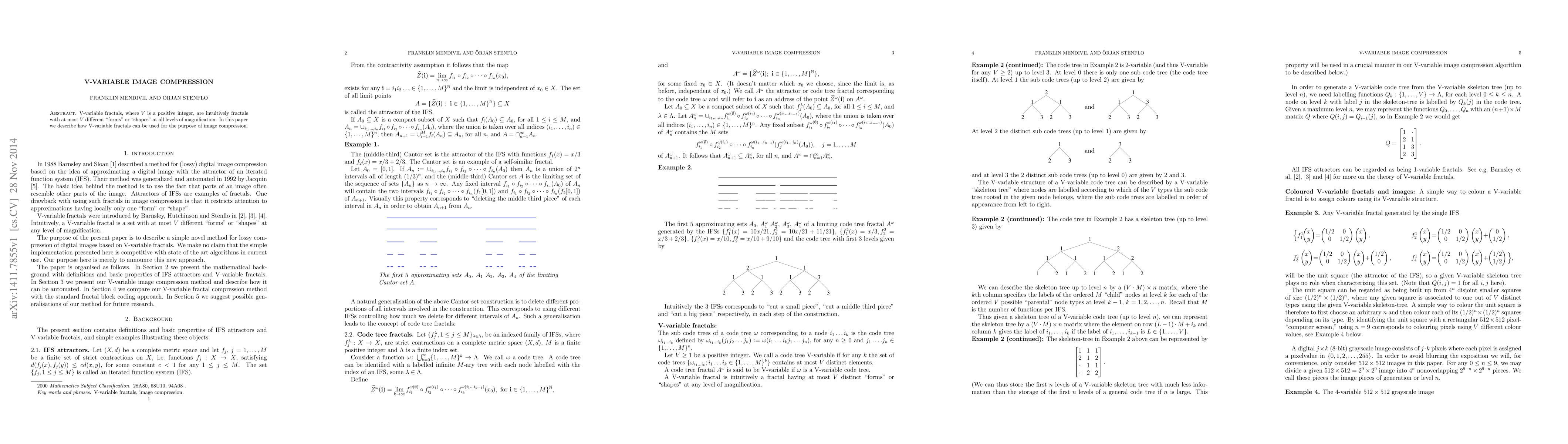 This paper explores the use of V-variable fractals, which contain at most $V$ distinct shapes, for image compression. The method leverages these fractals to achieve efficient and effective image compression.