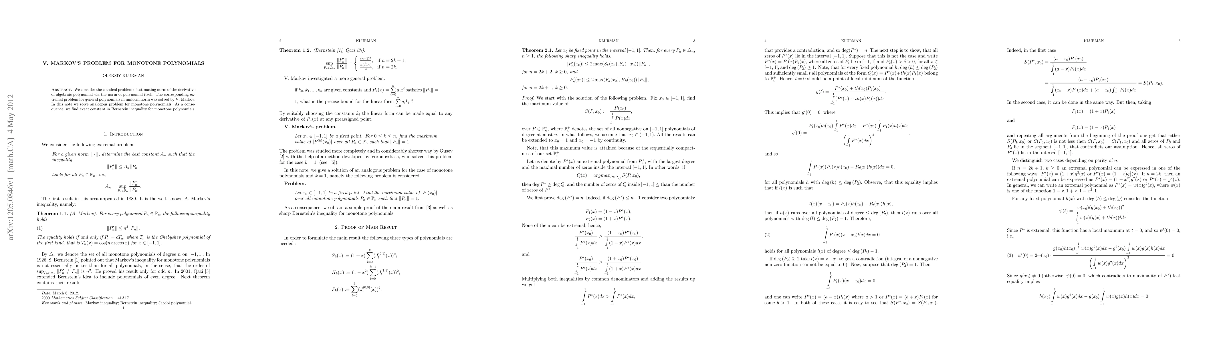 We consider the classical problem of estimating norm of the derivative of algebraic polynomial via the norm of polynomial itself. The corresponding extremal problem for general polynomials in uniform norm was solved by V. Markov. In this note we solve analogous problem for monotone polynomials. As a consequence, we find exact constant in Bernstein inequality for monotone polynomials.