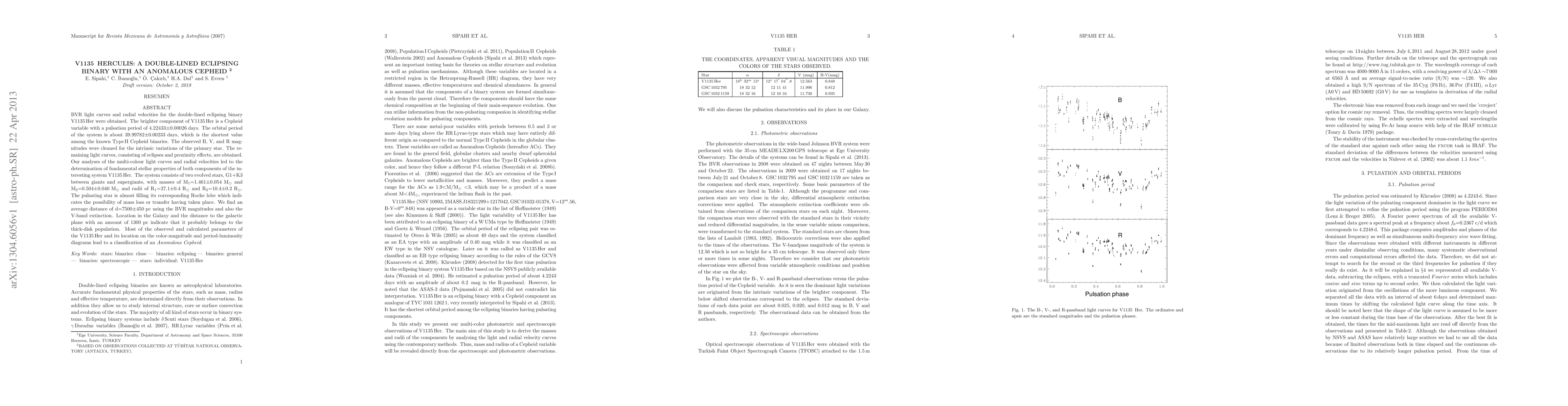 V1135 Herculis is a double-lined eclipsing binary with an Anomalous Cepheid. The Cepheid component has a pulsation period of 4.224 days, and the system's orbital period is 39.998 days, the shortest among Type II Cepheid binaries. The system comprises two evolved stars with masses and radii indicating mass loss or transfer, and it likely belongs to the thick-disk population.
