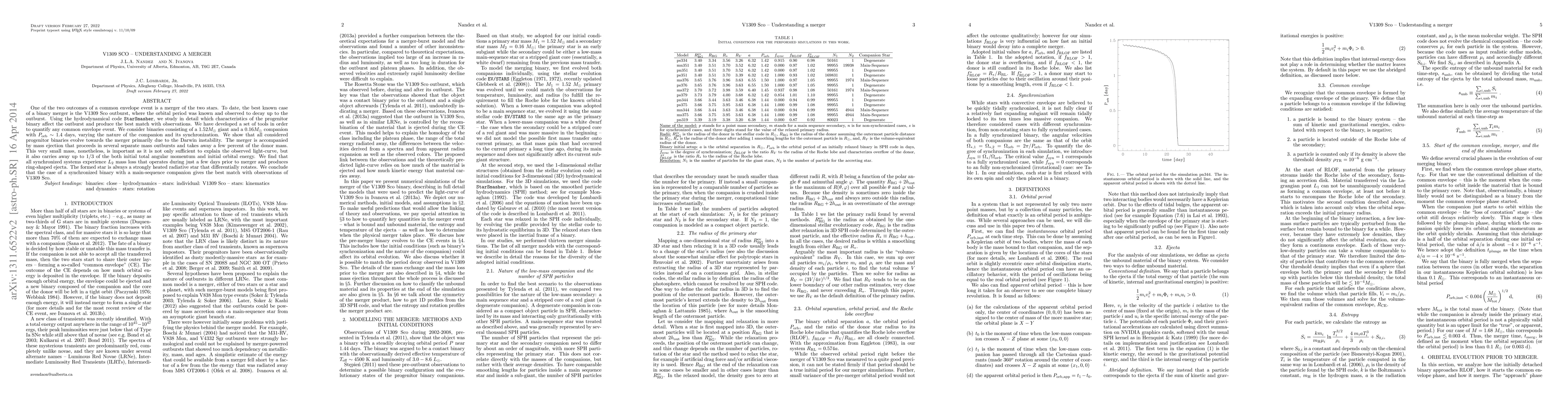 One of the two outcomes of a common envelope event is a merger of the two stars. To date, the best known case of a binary merger is the V1309 Sco outburst, where the orbital period was known and observed to decay up to the outburst. Using the hydrodynamical code StarSmasher, we study in detail which characteristics of the progenitor binary affect the outburst and produce the best match with observations. We have developed a set of tools in order to quantify any common envelope event. We consider binaries consisting of a 1.52$M_\odot$ giant and a 0.16$M_\odot$ companion with $P_{\rm orb}\sim1.4$ days, varying the nature of the companion and its synchronization. We show that all considered progenitor binaries evolve towards the merger primarily due to the Darwin instability. The merger is accompanied by mass ejection that proceeds in several separate mass outbursts and takes away a few percent of the donor mass. This very small mass, nonetheless, is important as it is not only sufficient to explain the observed light-curve, but it also carries away up to 1/3 of the both initial total angular momentum and initial orbital energy. We find that all synchronized systems experience $L_2$ mass loss that operates during just a few days prior to merger and produces ring-shaped ejecta. The formed star is always a strongly heated radiative star that differentially rotates. We conclude that the case of a synchronized binary with a main-sequence companion gives the best match with observations of V1309 Sco.