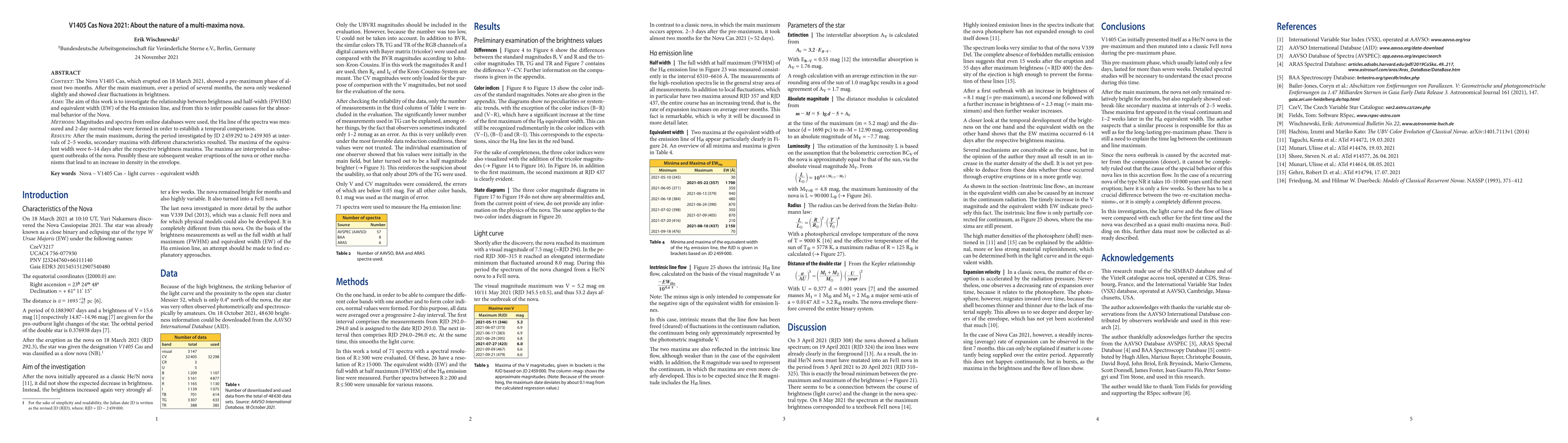 The Nova V1405 Cas exhibited unusual brightness fluctuations post-main maximum in 2021, with secondary maxima inferred from H-alpha emission line characteristics. These secondary maxima suggest either weaker eruptions or density increases in the nova's envelope.
