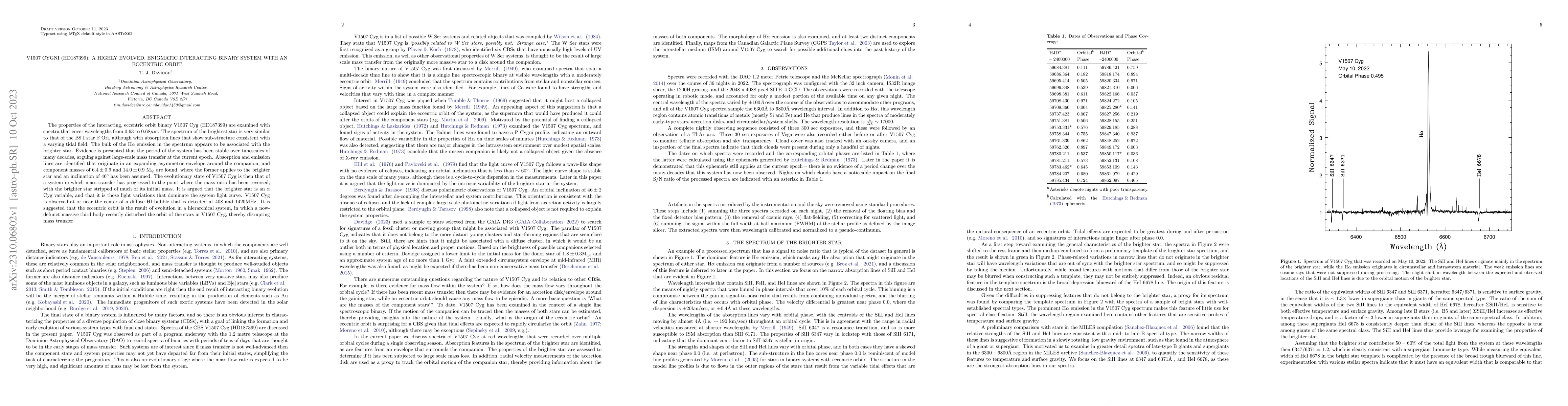 The properties of the interacting, eccentric orbit binary V1507 Cyg (HD187399) are examined with spectra that cover wavelengths from 0.63 to 0.68um. The spectrum of the brightest star is very similar to that of the B8 I star Beta Ori, although with absorption lines that show sub-structure consistent with a varying tidal field. The bulk of the Halpha emission in the spectrum appears to be associated with the brighter star. Evidence is presented that the period of the system has been stable over timescales of many decades, arguing against large-scale mass transfer at the current epoch. Absorption and emission lines are identified that originate in an expanding asymmetric envelope around the companion, and component masses of 6.4 +/- 0.9 and 14.0 +/- 0.9 solar are found, where the former applies to the brighter star and an inclination of 46 degrees has been assumed. The evolutionary state of V1507 Cyg is then that of a system in which mass transfer has progressed to the point where the mass ratio has been reversed, with the brighter star stripped of much of its initial mass. It is argued that the brighter star is an Alpha Cyg variable, and that it is those light variations that dominate the system light curve. V1507 Cyg is observed at or near the center of a diffuse HI bubble that is detected at 408 and 1420MHz. It is suggested that the eccentric orbit is the result of evolution in a hierarchical system.