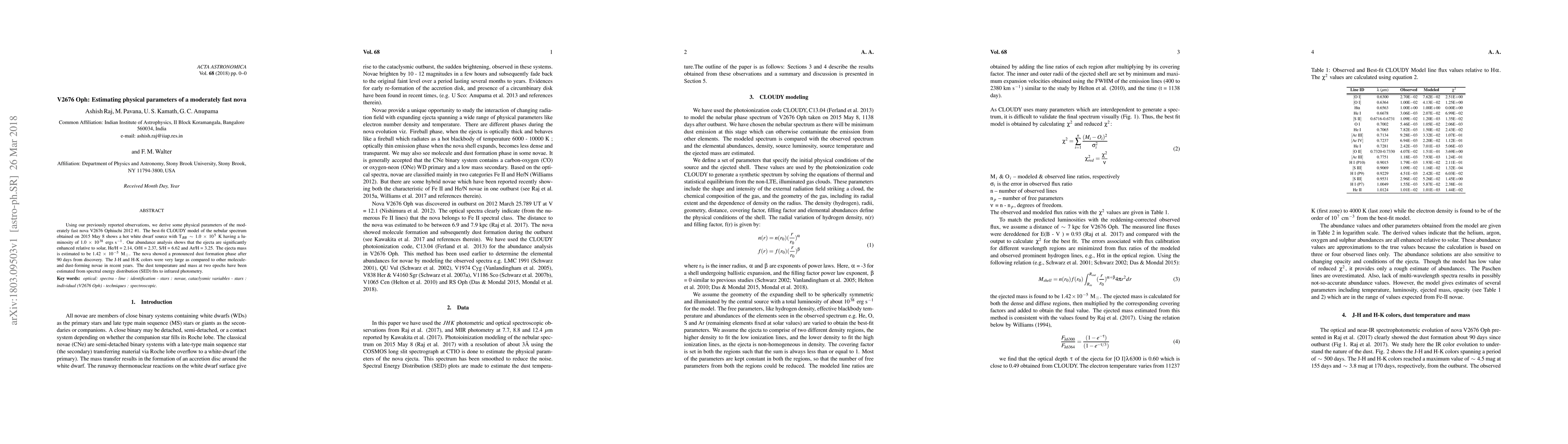 Using our previously reported observations, we derive some physical parameters of the moderately fast nova V2676 Ophiuchi 2012 # 1. The best-fit CLOUDY model of the nebular spectrum obtained on 2015 May 8 shows a hot white dwarf source with Tbb = 1.0 x 10^{5} K having a luminosity of 1.0 x 10^{38} ergs/s. Our abundance analysis shows that the ejecta are significantly enhanced relative to solar, He/H = 2.14, O/H = 2.37, S/H = 6.62 and Ar/H = 3.25. The ejecta mass is estimated to be 1.42 x 10^{-5} Msun. The nova showed a pronounced dust formation phase after 90 days from discovery. The J-H and H-K colors were very large as compared to other molecule- and dust-forming novae in recent years. The dust temperature and mass at two epochs have been estimated from spectral energy distribution (SED) fits to infrared photometry.