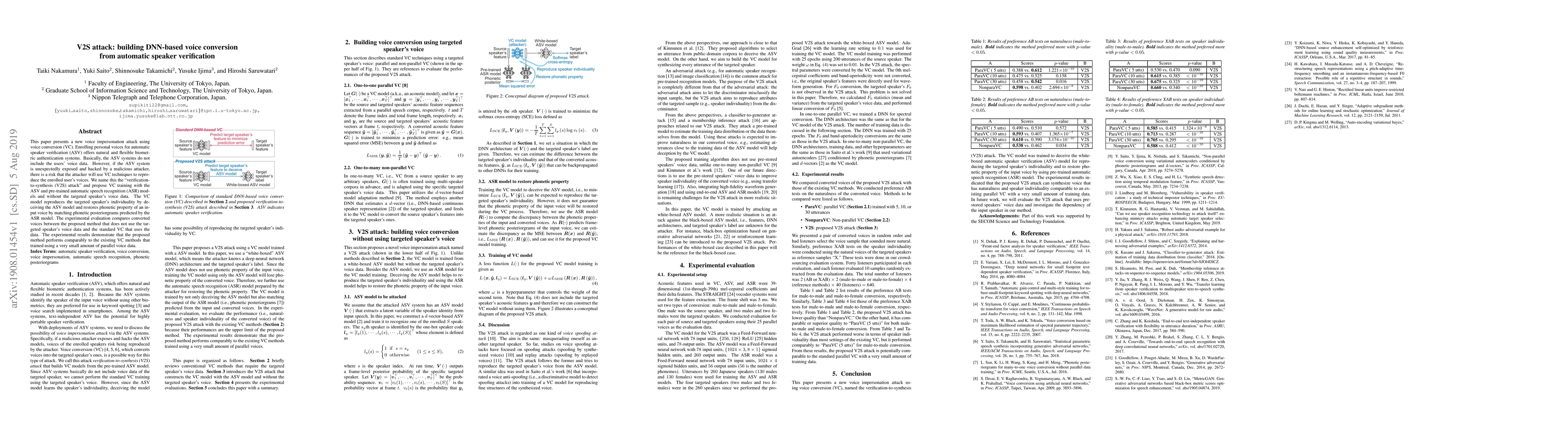 This paper introduces a new voice impersonation attack termed "V2S attack," which uses voice conversion techniques to reproduce enrolled voices from automatic speaker verification systems without requiring the targeted speaker's voice data. The proposed method trains the voice conversion model using ASV and ASR models, achieving results comparable to standard VC methods that use limited parallel voice data.