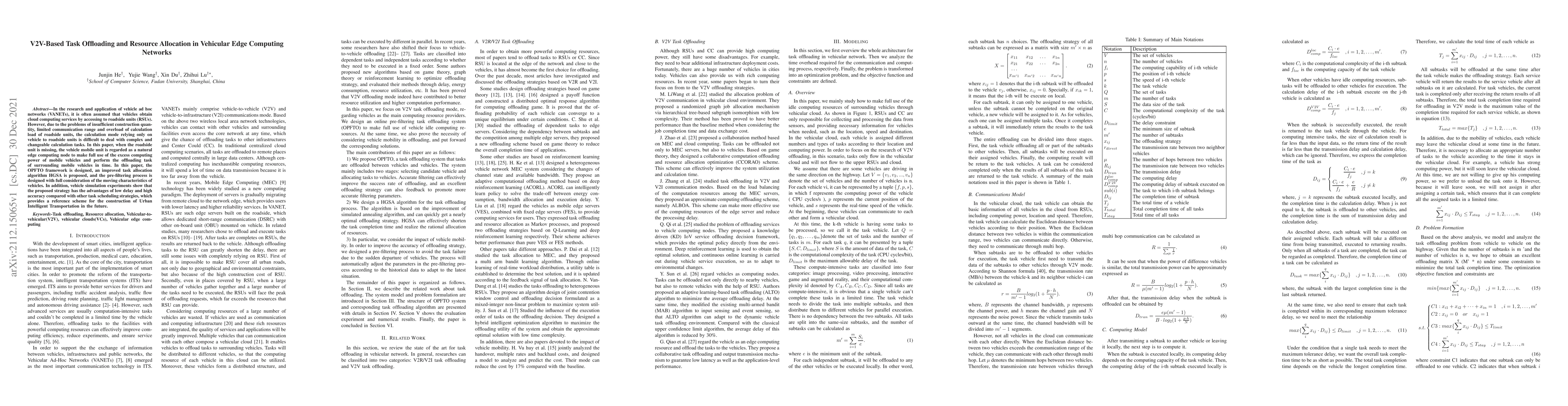 In the research and application of vehicle ad hoc networks (VANETs), it is often assumed that vehicles obtain cloud computing services by accessing to roadside units (RSUs). However, due to the problems of insufficient construction quantity, limited communication range and overload of calculation load of roadside units, the calculation mode relying only on vehicle to roadside units is difficult to deal with complex and changeable calculation tasks. In this paper, when the roadside unit is missing, the vehicle mobile unit is regarded as a natural edge computing node to make full use of the excess computing power of mobile vehicles and perform the offloading task of surrounding mobile vehicles in time. In this paper, the OPFTO framework is designed, an improved task allocation algorithm HGSA is proposed, and the pre-filtering process is designed with full consideration of the moving characteristics of vehicles. In addition, vehicle simulation experiments show that the proposed strategy has the advantages of low delay and high accuracy compared with other task scheduling strategies, which provides a reference scheme for the construction of Urban Intelligent Transportation in the future.