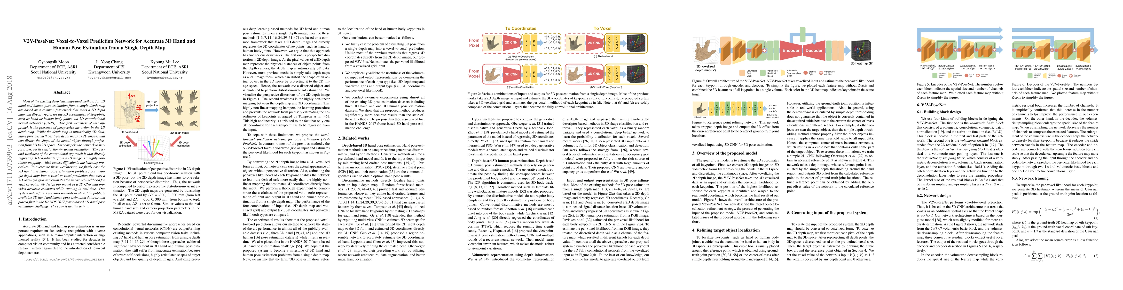The paper introduces V2V-PoseNet, a 3D CNN-based voxel-to-voxel prediction network for accurate 3D hand and human pose estimation from a single depth map, addressing perspective distortion and non-linear mapping issues inherent in conventional 2D CNN-based methods. The proposed model outperforms existing methods on multiple 3D pose estimation datasets.