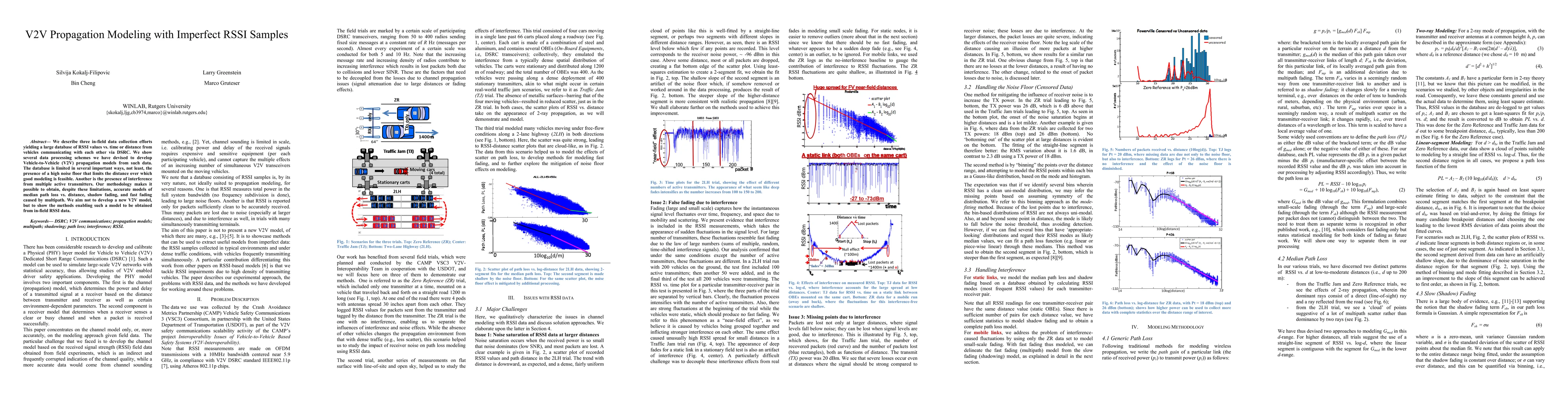 We describe three in-field data collection efforts yielding a large database of RSSI values vs. time or distance from vehicles communicating with each other via DSRC. We show several data processing schemes we have devised to develop Vehicle-to-Vehicle (V2V) propagation models from such data. The database is limited in several important ways, not least, the presence of a high noise floor that limits the distance over which good modeling is feasible. Another is the presence of interference from multiple active transmitters. Our methodology makes it possible to obtain, despite these limitations, accurate models of median path loss vs. distance, shadow fading, and fast fading caused by multipath. We aim not to develop a new V2V model, but to show the methods enabling such a model to be obtained from in-field RSSI data.