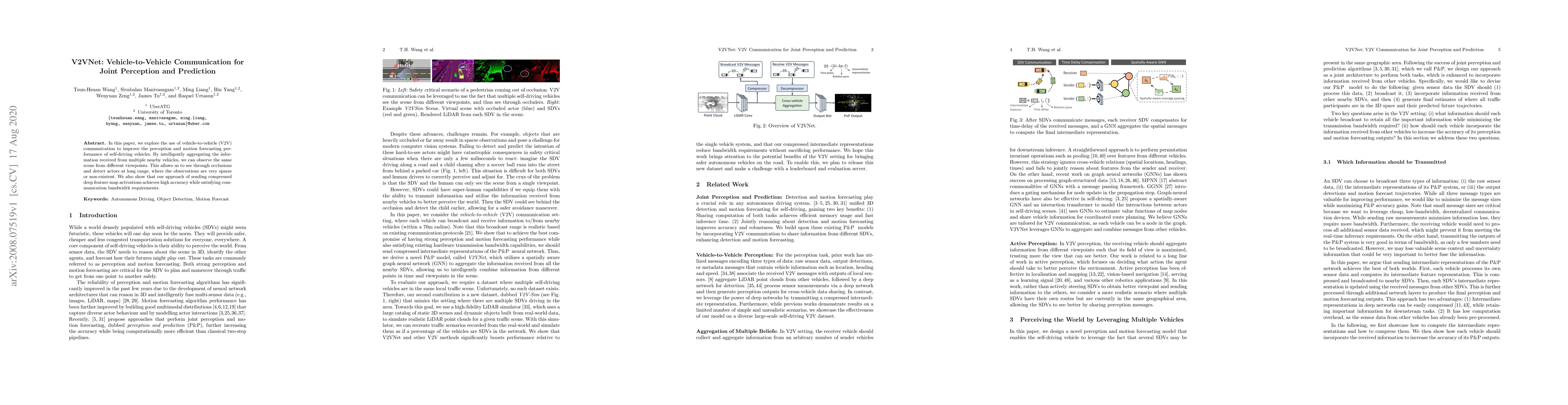 Summary: This paper investigates V2V communication to enhance self-driving vehicles' perception and prediction by aggregating data from multiple vehicles, improving scene observation and long-range detection. The proposed method of transmitting compressed deep feature maps maintains high accuracy while meeting bandwidth constraints.
