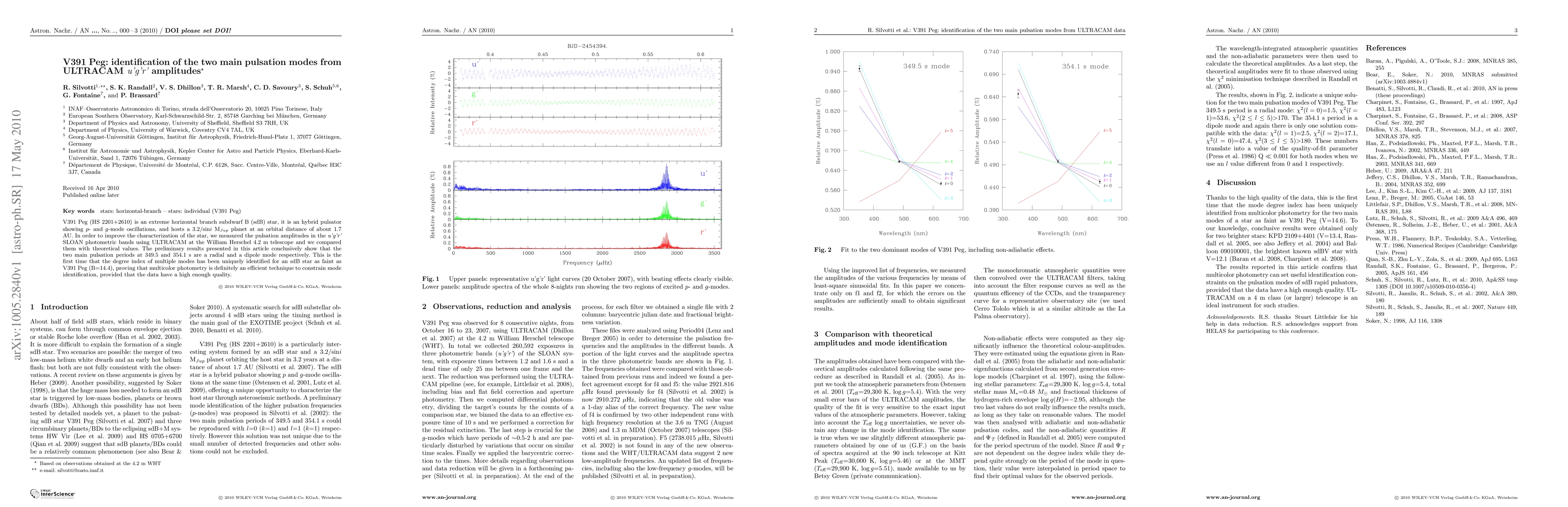 V391 Peg (HS2201+2610) is an extreme horizontal branch subdwarf B (sdB) star, it is an hybrid pulsator showing p- and g-mode oscillations, and hosts a 3.2/sini M_Jup planet at an orbital distance of about 1.7 AU. In order to improve the characterization of the star, we measured the pulsation amplitudes in the u'g'r' SLOAN photometric bands using ULTRACAM at the William Herschel 4.2 m telescope and we compared them with theoretical values. The preliminary results presented in this article conclusively show that the two main pulsation periods at 349.5 and 354.1 s are a radial and a dipole mode respectively. This is the first time that the degree index of multiple modes has been uniquely identified for an sdB star as faint as V391 Peg (B=14.4), proving that multicolor photometry is definitely an efficient technique to constrain mode identification, provided that the data have a high enough quality.