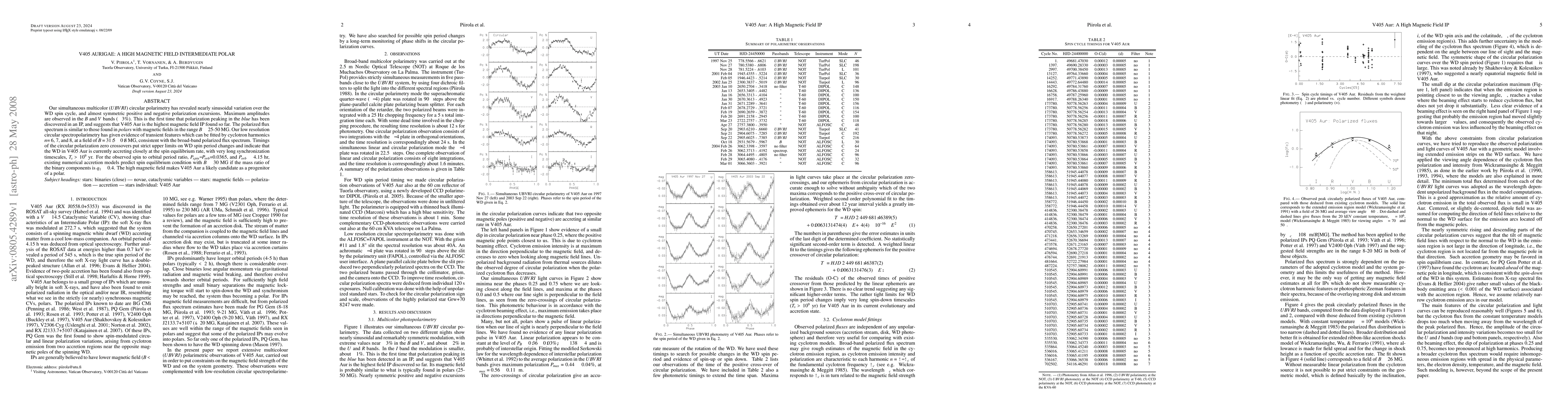 Our simultaneous multicolor (UBVRI) circular polarimetry has revealed nearly sinusoidal variation over the WD spin cycle, and almost symmetric positive and negative polarization excursions. Maximum amplitudes are observed in the B and V bands (+-3 %). This is the first time that polarization peaking in the blue has been discovered in an IP, and suggests that V405 Aur is the highest magnetic field IP found so far. The polarized flux spectrum is similar to those found in polars with magnetic fields in the range B ~ 25-50 MG. Our low resolution circular spectropolarimetry has given evidence of transient features which can be fitted by cyclotron harmonics n = 6, 7, and 8, at a field of B = 31.5 +- 0.8 MG, consistent with the broad-band polarized flux spectrum. Timings of the circular polarization zero crossovers put strict upper limits on WD spin period changes and indicate that the WD in V405 Aur is currently accreting closely at the spin equilibrium rate, with very long synchronization timescales, T_s > 10^9 yr. For the observed spin to orbital period ratio, P_{spin}/P_{orb} = 0.0365, and P_{orb} ~ 4.15 hr, existing numerical accretion models predict spin equilibrium condition with B ~ 30 MG if the mass ratio of the binary components is q_1 ~ 0.4. The high magnetic field makes V405 Aur a likely candidate as a progenitor of a polar.