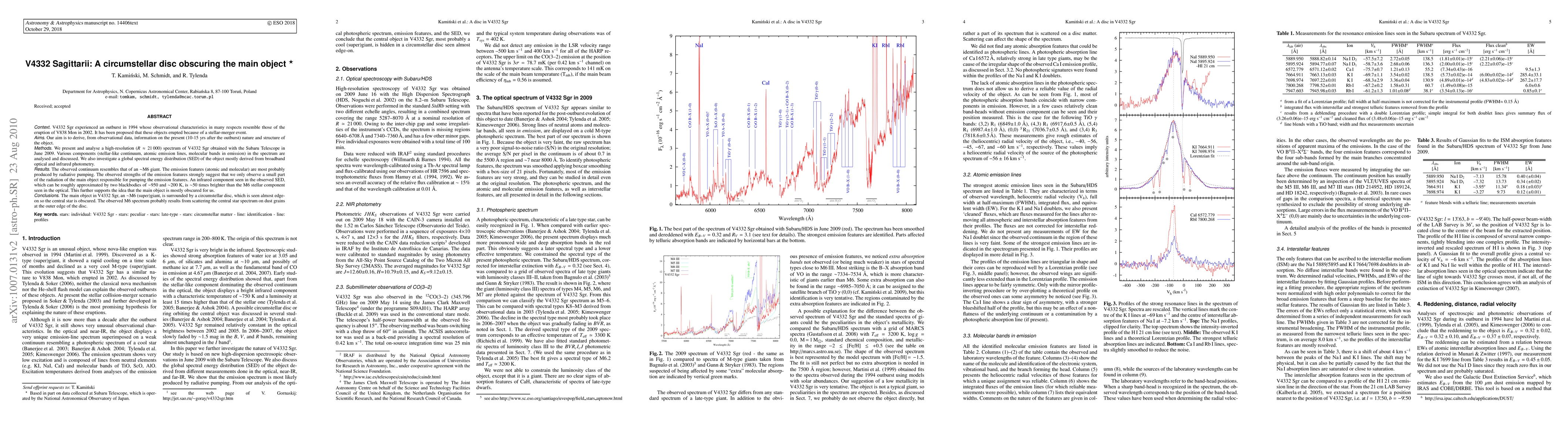 V4332 Sgr experienced an outburst in 1994 whose observational characteristics in many respects resemble those of the eruption of V838 Mon in 2002. It has been proposed that these objects erupted because of a stellar-merger event. Our aim is to derive, from observational data, information on the present (10-15 yrs after the outburst) nature and structure of the object. We present and analyse a high-resolution (R = 21 000) spectrum of V4332 Sgr obtained with the Subaru Telescope in June 2009. Various components (stellar-like continuum, atomic emission lines, molecular bands in emission) in the spectrum are analysed and discussed. We also investigate a global spectral energy distribution (SED) of the object mostly derived from broadband optical and infrared photometry. The observed continuum resembles that of an M6 giant. The emission features (atomic and molecular) are most probably produced by radiative pumping. The observed strengths of the emission features strongly suggest that we only observe a small part of the radiation of the main object responsible for pumping the emission features. An infrared component seen in the observed SED, which can be roughly approximated by two blackbodies of 950 and 200 K, is 50 times brighter than the M6 stellar component seen in the optical. This further supports the idea that the main object is mostly obscured for us. The main object in V4332 Sgr, an M6 (super)giant, is surrounded by a circumstellar disc, which is seen almost edge-on so the central star is obscured. The observed M6 spectrum probably results from scattering the central star spectrum on dust grains at the outer edge of the disc.