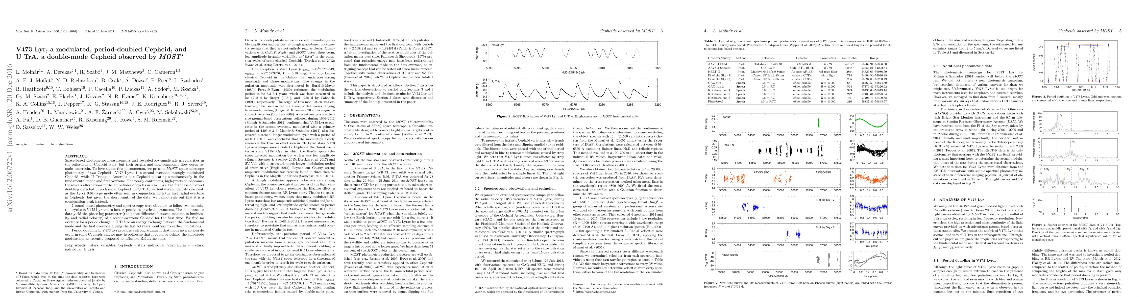Space-based photometric measurements first revealed low-amplitude irregularities in the pulsations of Cepheid stars, but their origins and how commonly they occur remain uncertain. To investigate this phenomenon, we present MOST space telescope photometry of two Cepheids. V473 Lyrae is a second-overtone, strongly modulated Cepheid, while U Trianguli Australis is a Cepheid pulsating simultaneously in the fundamental mode and first overtone. The nearly continuous, high-precision photometry reveals alternations in the amplitudes of cycles in V473 Lyr, the first case of period doubling detected in a classical Cepheid. In U TrA, we tentatively identify one peak as the $f_X$ or 0.61-type mode often seen in conjunction with the first radial overtone in Cepheids, but given the short length of the data, we cannot rule out that it is a combination peak instead. Ground-based photometry and spectroscopy were obtained to follow two modulation cycles in V473 Lyr and to better specify its physical parameters. The simultaneous data yield the phase lag parameter (the phase difference between maxima in luminosity and radial velocity) of a second-overtone Cepheid for the first time. We find no evidence for a period change in U TrA or an energy exchange between the fundamental mode and the first overtone during the last 50 years, contrary to earlier indications. Period doubling in V473 Lyr provides a strong argument that mode interactions do occur in some Cepheids and we may hypothesise that it could be behind the amplitude modulation, as recently proposed for Blazhko RR Lyrae stars.