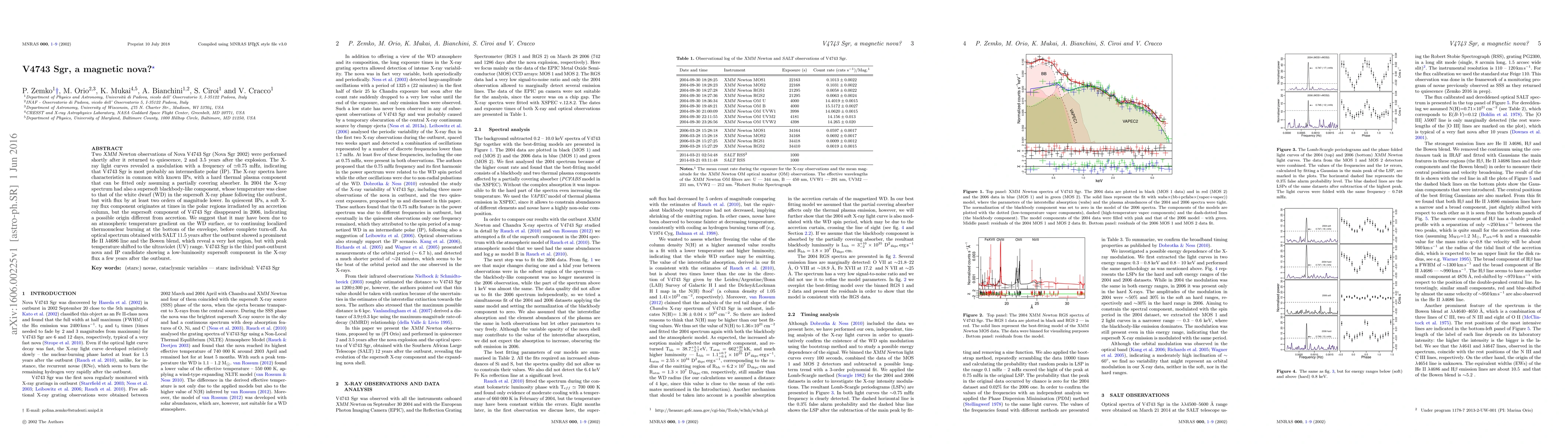 Nova V4743 Sgr (Nova Sgr 2002) is identified as an intermediate polar (IP) based on XMM Newton observations, showing modulation indicative of magnetic activity. A supersoft X-ray component, possibly due to localized thermonuclear burning or temperature gradient on the white dwarf, was detected but disappeared by 2006.