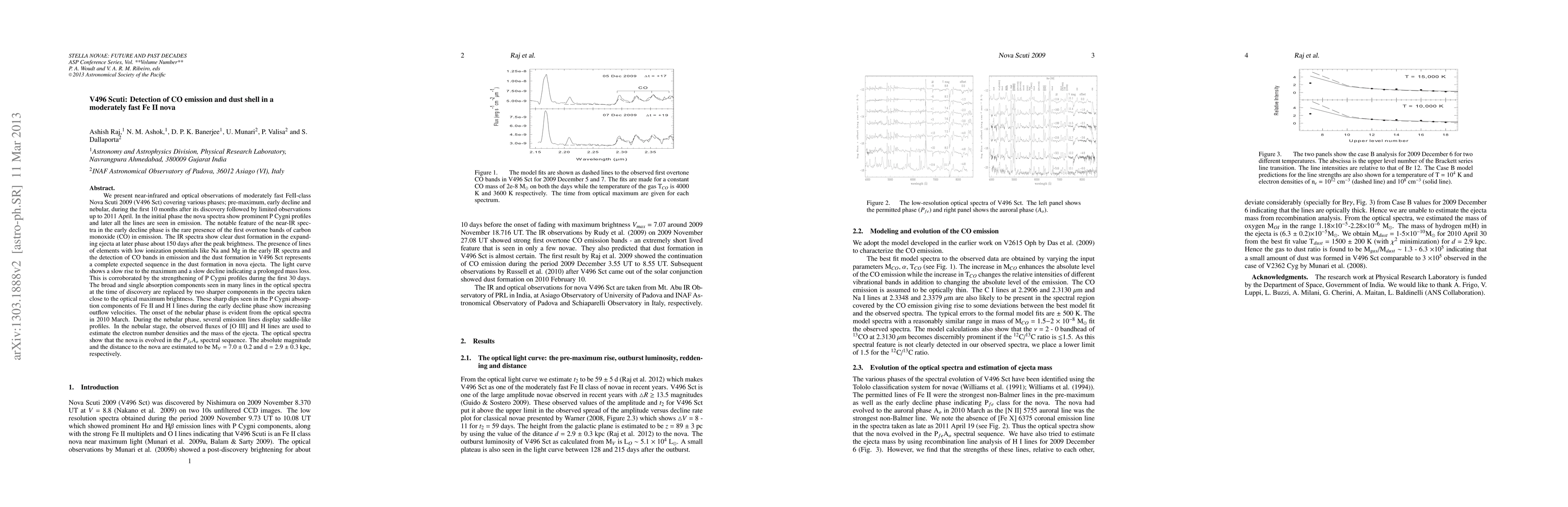 We present near-infrared and optical observations of moderately fast FeII-class Nova Scuti 2009 (V496 Sct) covering various phases; pre-maximum, early decline and nebular, during the first 10 months after its discovery followed by limited observations up to 2011 April. In the initial phase the nova spectra show prominent P Cygni profiles and later all the lines are seen in emission. The notable feature of the near-IR spec- tra in the early decline phase is the rare presence of the first overtone bands of carbon monoxide (CO) in emission. The IR spectra show clear dust formation in the expand- ing ejecta at later phase about 150 days after the peak brightness. The presence of lines of elements with low ionization potentials like Na and Mg in the early IR spectra and the detection of CO bands in emission and the dust formation in V496 Sct represents a complete expected sequence in the dust formation in nova ejecta. The light curve shows a slow rise to the maximum and a slow decline indicating a prolonged mass loss. This is corroborated by the strengthening of P Cygni profiles during the first 30 days. The broad and single absorption components seen in many lines in the optical spectra at the time of discovery are replaced by two sharper components in the spectra taken close to the optical maximum brightness. These sharp dips seen in the P Cygni absorption components of Fe II and H I lines during the early decline phase show increasing outflow velocities. The onset of the nebular phase is evident from the optical spectra in 2010 March. During the nebular phase, several emission lines display saddle-like profiles. In the nebular stage, the observed fluxes of [O III] and H lines are used to estimate the electron number densities and the mass of the ejecta. The optical spectra show that the nova is evolved in the P_fe A_o spectral sequence.