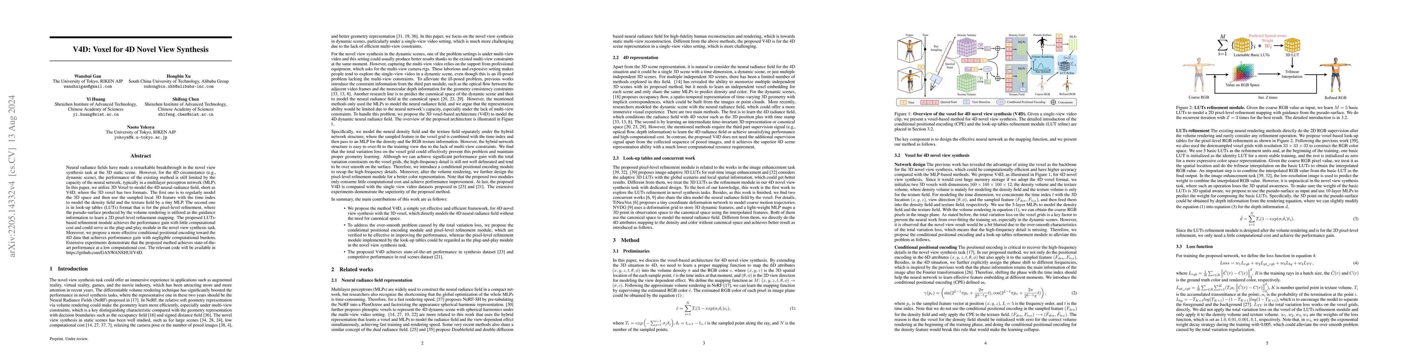 The paper introduces V4D, a 3D voxel-based approach for 4D novel view synthesis in dynamic scenes, employing both local 3D features with a tiny MLP and pixel-level refinement using look-up tables for performance gains. It also proposes an effective conditional positional encoding for 4D data, achieving state-of-the-art results with minimal computational cost.