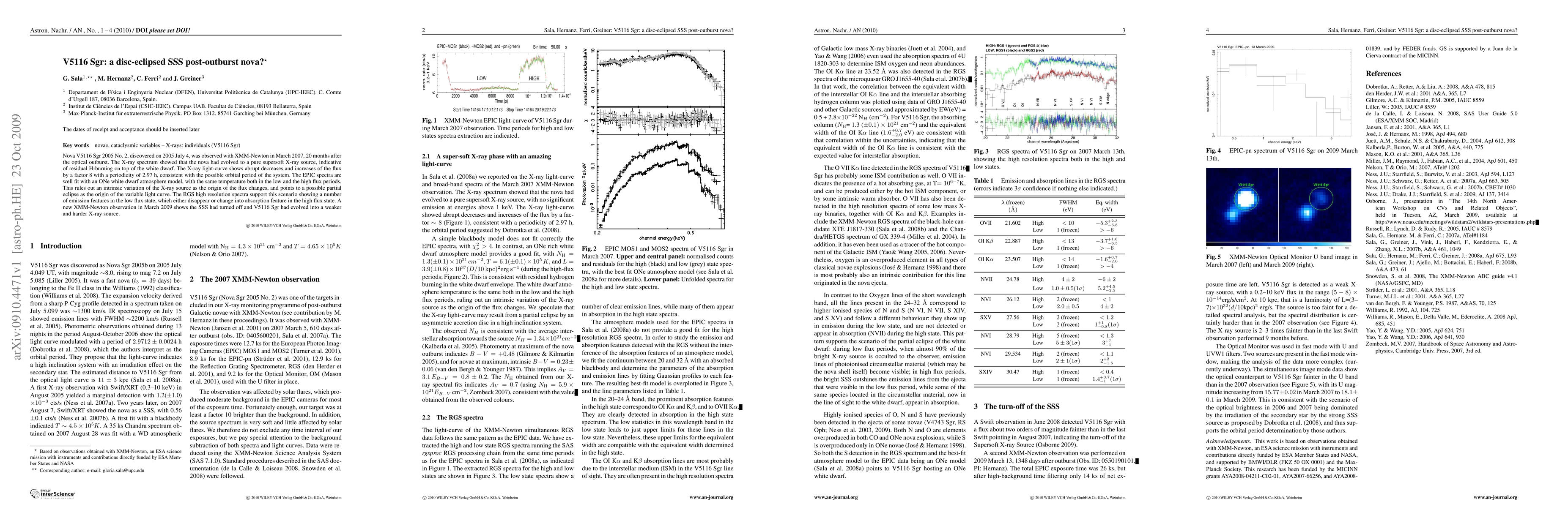 Nova V5116 Sgr 2005 No. 2, discovered on 2005 July 4, was observed with XMM-Newton in March 2007, 20 months after the optical outburst. The X-ray spectrum showed that the nova had evolved to a pure supersoft X-ray source, indicative of residual H-burning on top of the white dwarf. The X-ray light-curve shows abrupt decreases and increases of the flux by a factor 8 with a periodicity of 2.97h, consistent with the possible orbital period of the system. The EPIC spectra are well fit with an ONe white dwarf atmosphere model, with the same temperature both in the low and the high flux periods. This rules out an intrinsic variation of the X-ray source as the origin of the flux changes, and points to a possible partial eclipse as the origin of the variable light curve. The RGS high resolution spectra support this scenario showing a number of emission features in the low flux state, which either disappear or change into absorption features in the high flux state. A new XMM-Newton observation in March 2009 shows the SSS had turned off and V5116 Sgr had evolved into a weaker and harder X-ray source.