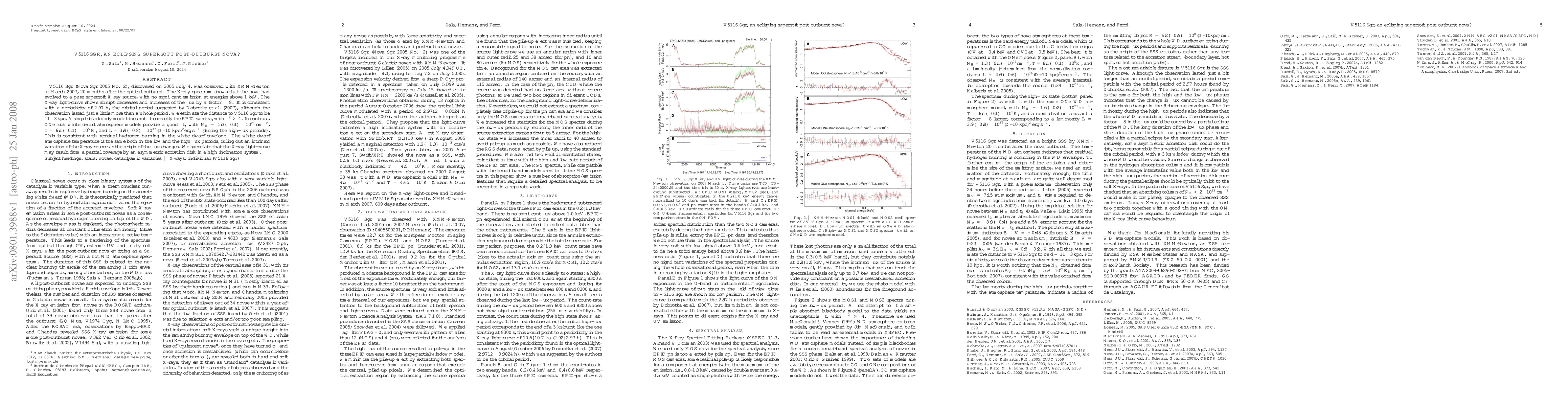 V5116 Sgr, a post-outburst nova, was observed as a supersoft X-ray source 20 months after its optical outburst, showing flux variations consistent with an orbital period. The X-ray spectrum suggests residual hydrogen burning in an ONe white dwarf, with the flux changes likely due to an asymmetric accretion disk.